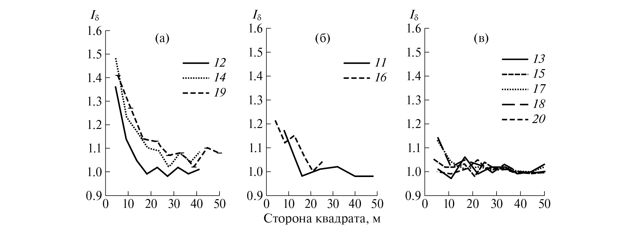 На рис. 3А приведены результаты проверки нулевой гипотезы моделированием однородного пуассоновского процесса для отдельных деревьев. Для ПП 14, 19, в меньшей степени для ПП 12 характерен «выход» графика изменения Iδ в зависимости от размера ячейки за пределы пуассоновского процесса или области принятия нулевой гипотезы [10], особенно при небольших размерах ячеек, что свидетельствует об агрегированном характере горизонтальной структуры. Учет агрегаций деревьев (рис. 3Б) существенно меняет картину. Значение Iδ становится меньше 1, хотя достоверно от нее не отличается. Групповое распределение сохраняется только для ПП 19. Для большинства же пробных площадей сохраняется случайный тип пространственного распределения (ПП 11, 12, 14, 19, 20), но в то же время для некоторых (ПП 13, 15, 16) отмечается переходный тип от случайного к равномерному.