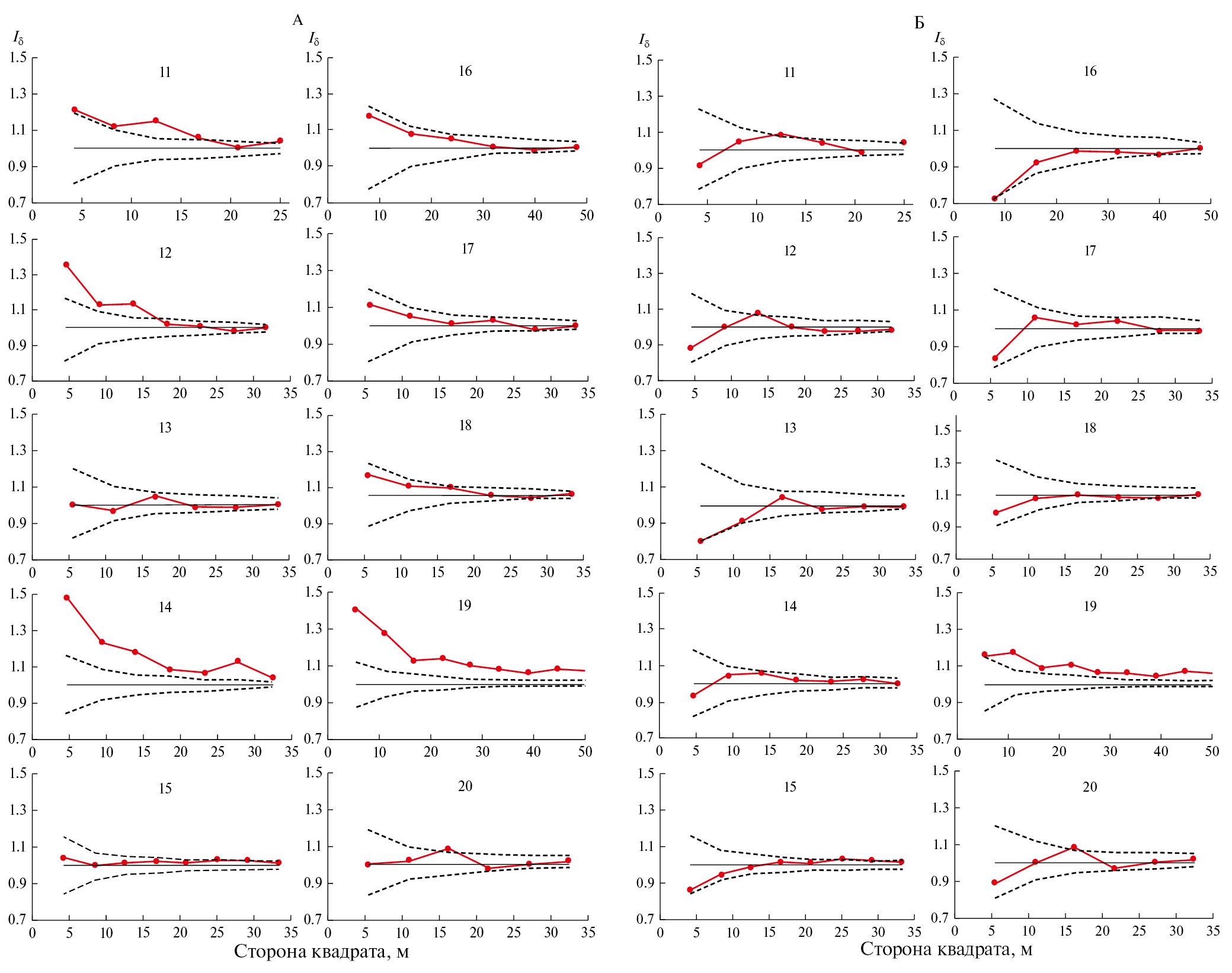 Рис. 3. Проверка гипотезы о случайном расположении деревьев моделированием однородного пуассоновского процесса: A – для отдельных деревьев, Б – для агрегаций деревьев. Цифрами указаны номера пробных площадей. Сплошная красная линия отражает изменение индекса Морисита в зависимости от размера квадрата, огибающие пунктирные линии ограничивают зону моделирования для различных уровней пуассоновского процесса.