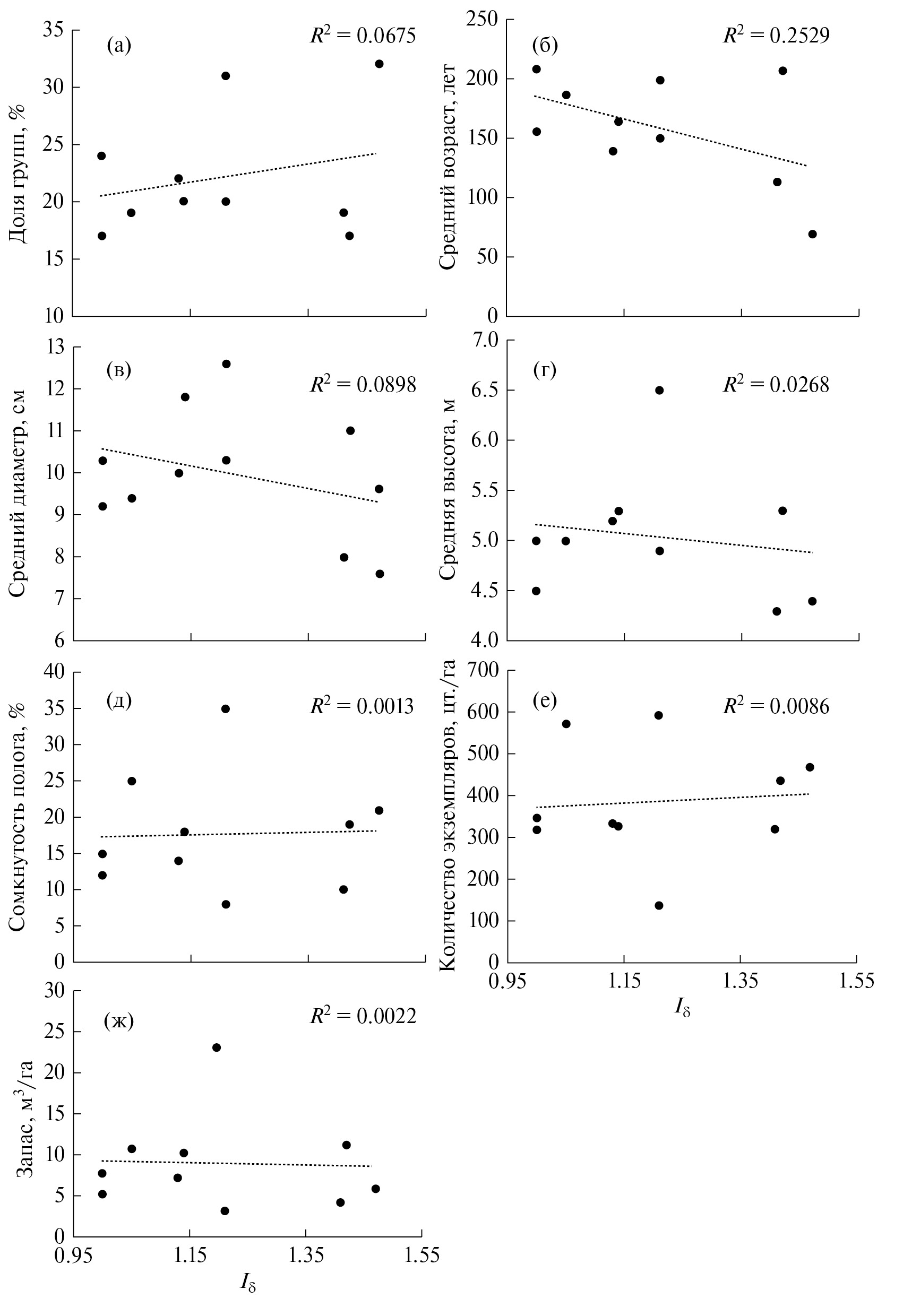 Без учета агрегации деревьев (рис. 4) положительная связь, при которой отмечается увеличение анализируемого показателя с ростом значения Iδ, выявлена с долей участия отдельных групп деревьев и густотой. Для среднего диаметра, высоты и возраста тренд отрицателен. В случае сомкнутости полога и объема стволовой древесины тренды менее выражены, поскольку данные характеристики тесно связаны с рассмотренными выше, тренды изменения которых имеют разнонаправленный характер.