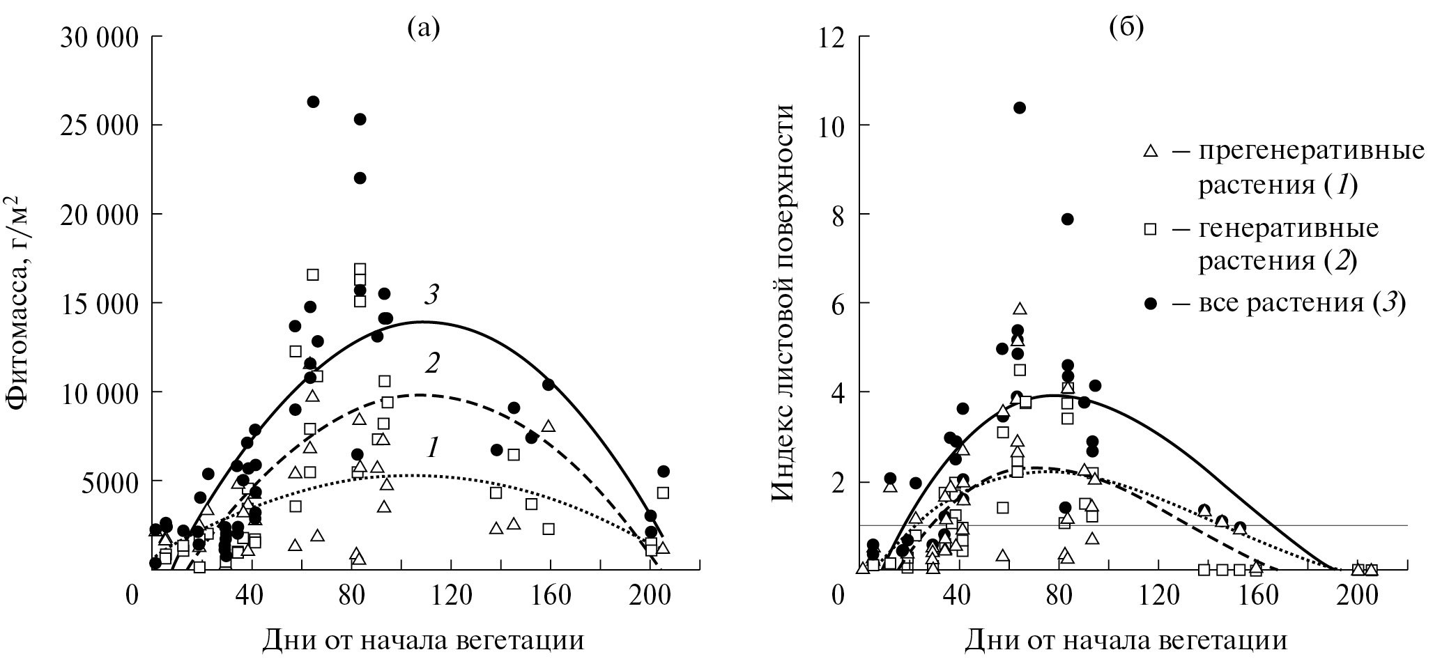 Площадь листовой поверхности растений менялась синхронно с накоплением фитомассы (см. рис. 2). В июле площадь листьев генеративных растений варьировала от 30 до 245 дм2/особь и была на порядок выше, чем у прегенеративных особей (см. табл. 2).