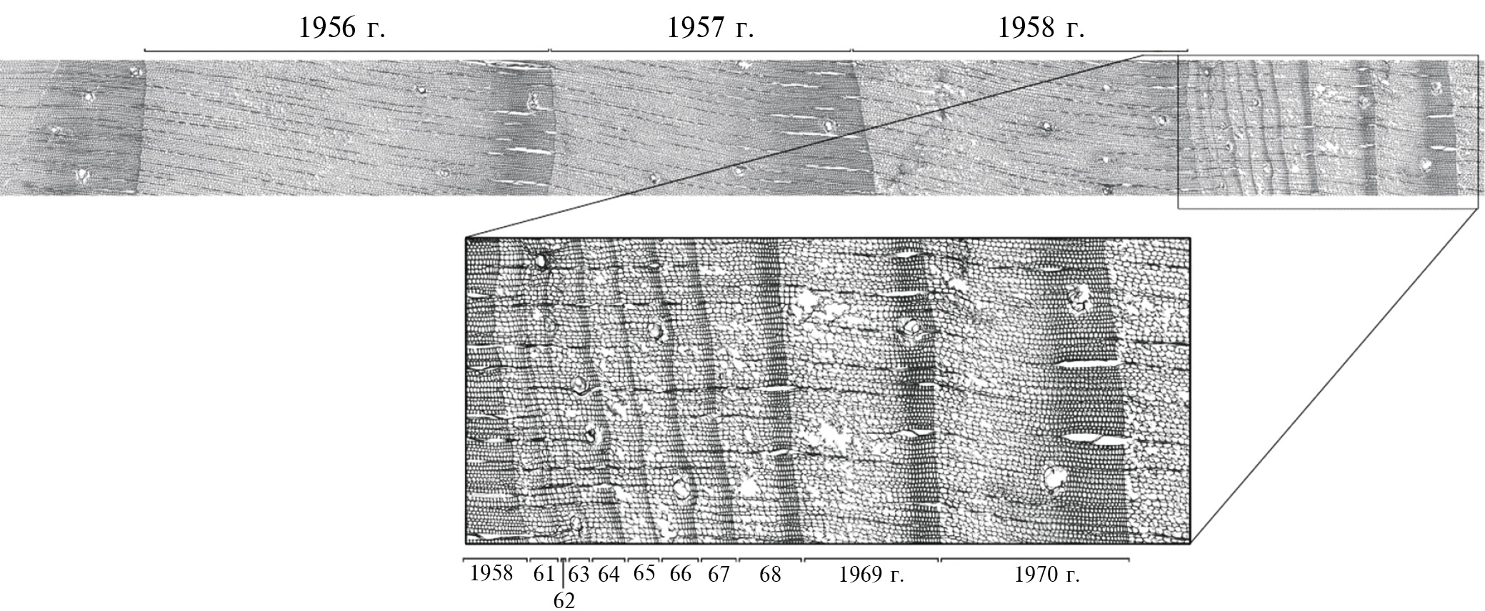 Рис. 1. Тонкий срез керна сосны обыкновенной из головной части ВУРСа (дерево № 1). На увеличенном фрагменте четко видны изменения анатомической структуры в годы после Кыштымской аварии