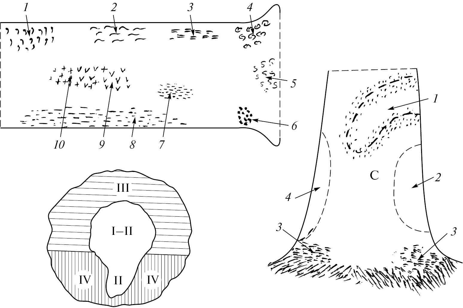 C — комель сухостойного остолопа березы: 1 – дупло с трухлявыми стенками, в которых развиваются личинки Elephantomyia sp. (Limoniidae) и личинки галлиц Haplusia Karsch, 1877 (= Johnsonomyia Felt, 1908) (Cecidomyiidae); 2 – личинки жуков сем. Eucnemidae; 3 – личинки туманниц (Canthyloscelidae); 4 – сухобочина, заселенная личинками усачей (Cerambycidae)