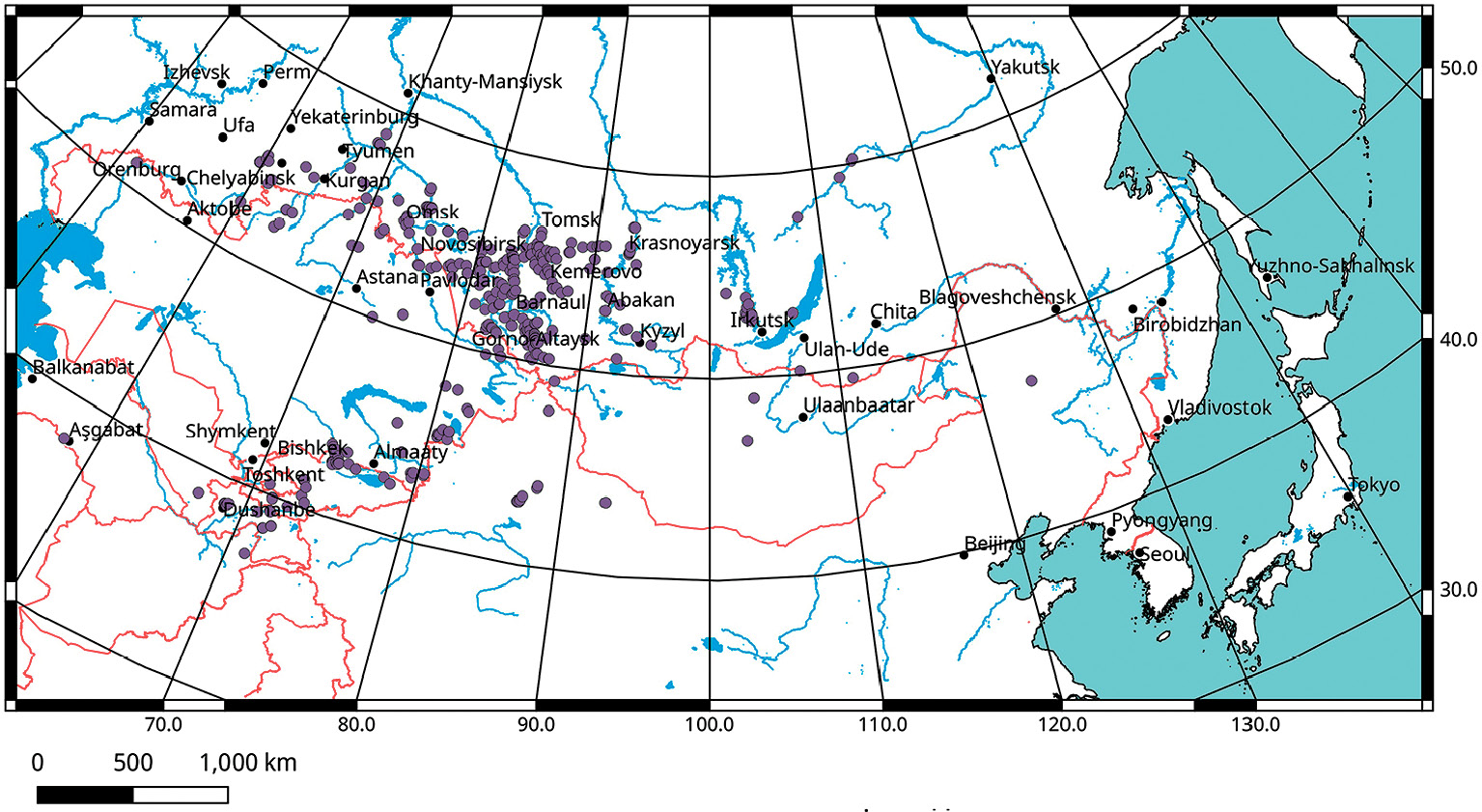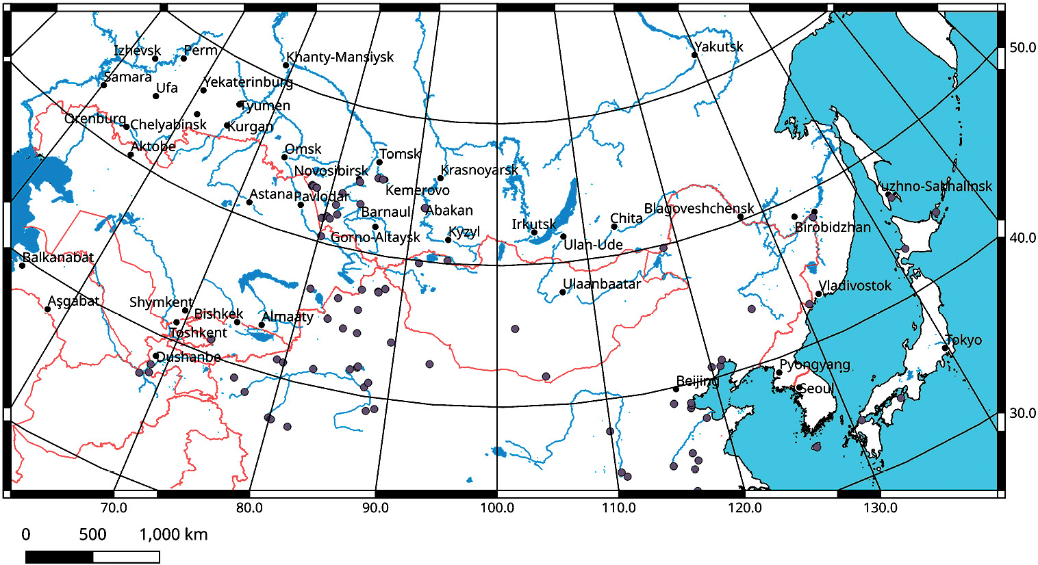 Рис. 2. Распространение Locusta migratoria (L.) на юге Сибири и в сопредельных регионах (без учета точек, зафиксированных во время подъемов численности или связанных с залетами вида)