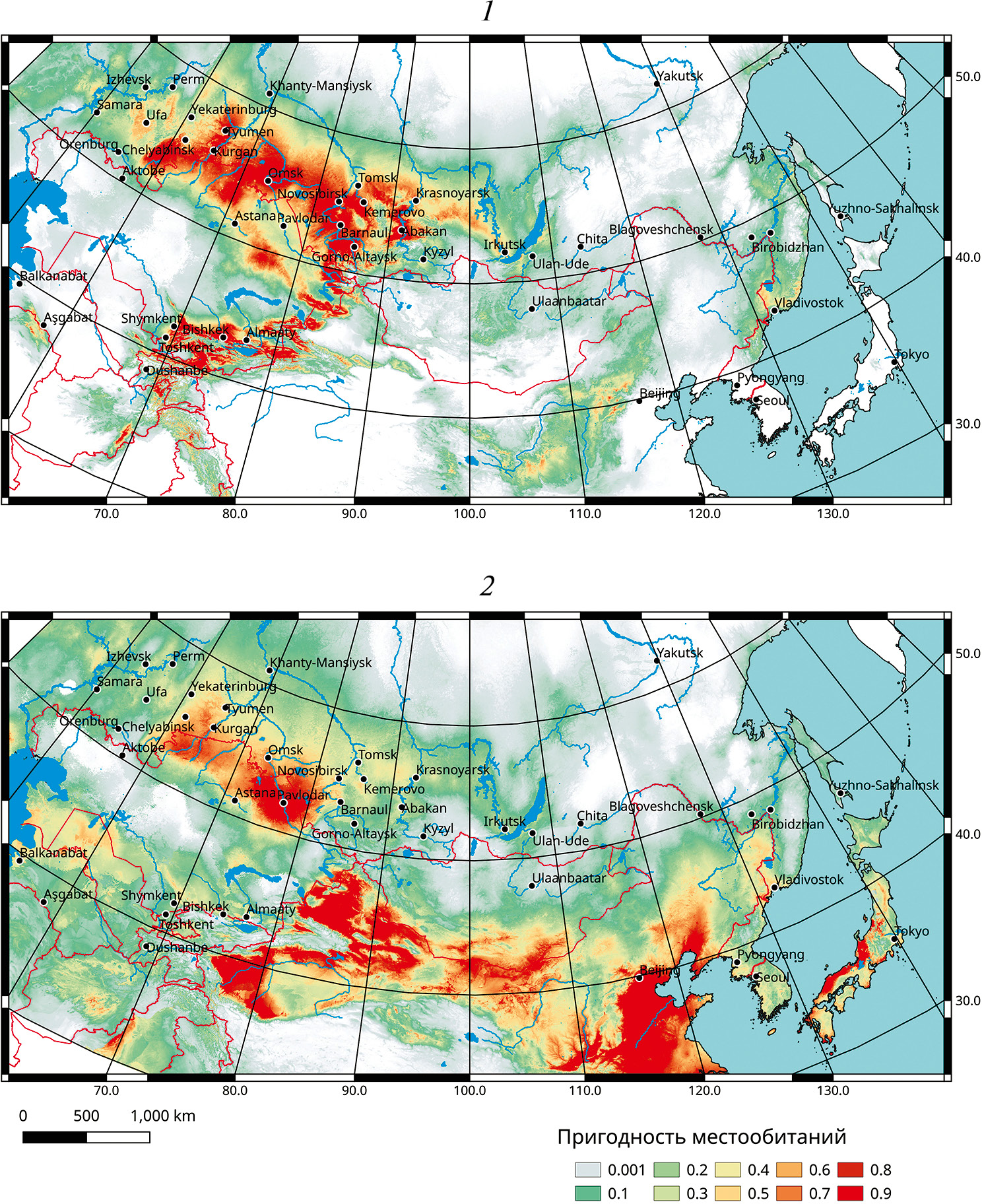 Рис. 3. Оценка пригодности местообитаний Chorthippus apricarius (L.) (1) и Locusta migratoria (L.) (2) на юге Сибири и в сопредельных регионах (все биоклиматические переменные для периода 1970–2000 гг.; средние по пикселям по 25 повторностям с кросс-валидацией)