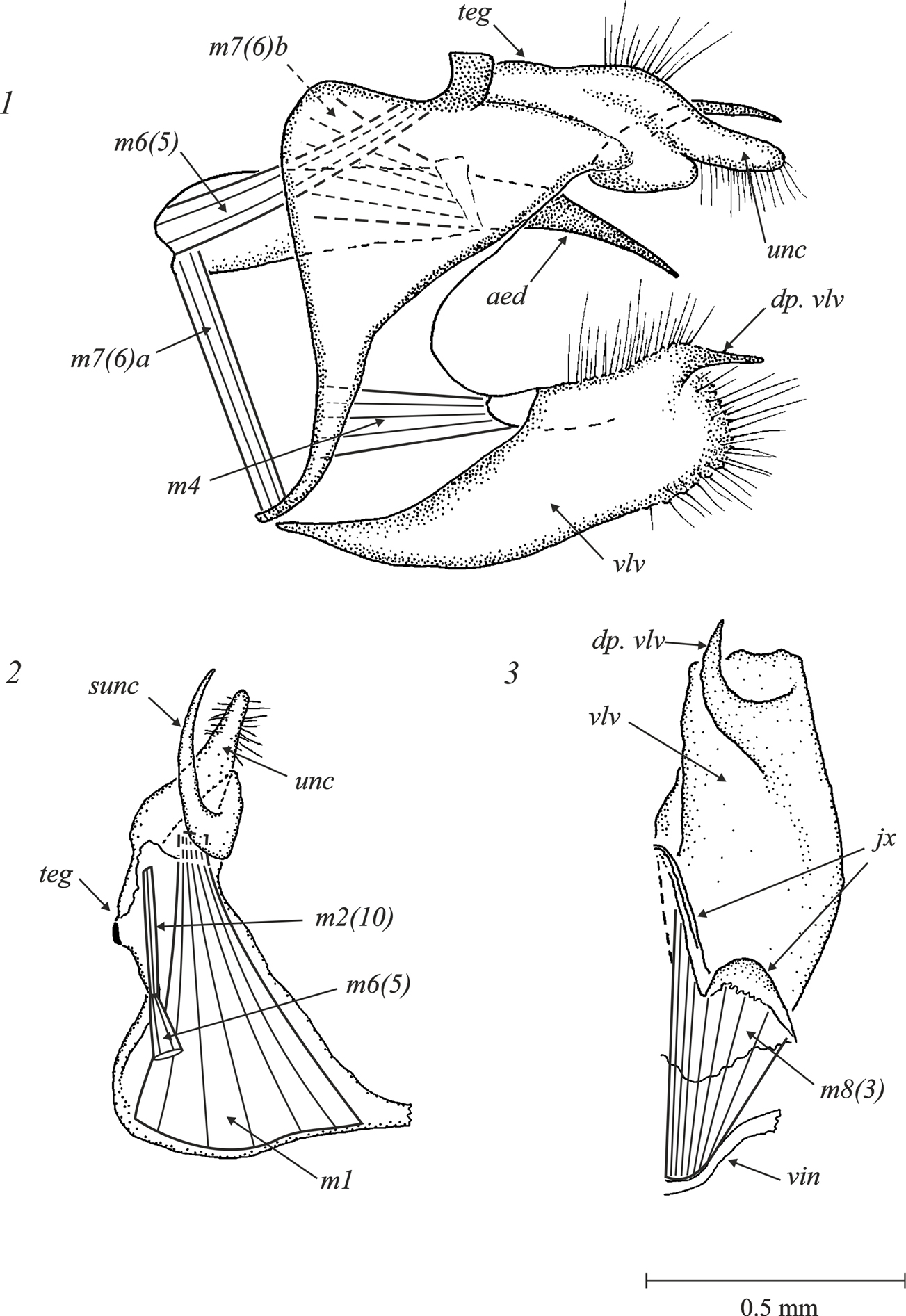 Рис. 6. Itylos nodo (Bálint et Johnson, 1995), фрагменты гениталий самцов, скелет и мускулатура. 1 — левая вальва и юкста, вид на медиальную поверхность; 2 — вальвы, вентральная сторона; 3 — винкулум, места прикрепления мышц, вид спереди. Обозначения см. в подписи к рис. 1.