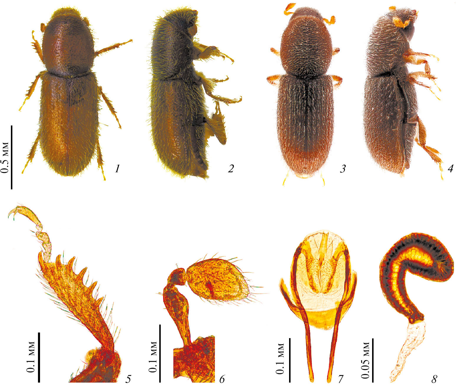Рис. 1. Cisurgus ferulae Pfeffer, общий вид жука и гениталии самца и самки (1, 2 – 12.29 км Ю с. Аккудук; 3‒8 – 30.89 км СЗ с. Егизкум). 1, 3 ‒ вид сверху; 2, 4 ‒ вид сбоку; 5 ‒ передняя голень; 6 – усик; 7 – эдеагус; 8 – сперматека.