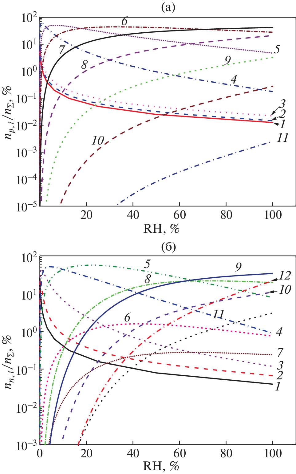 The rate of iron corrosion in a low-temperature plasma of moist air formed under the action of a fast electron beam, depending on the relative air humidity, was measured. It is shown that a beam of fast electrons (radioactive β-radiation) significantly intensifies the corrosion of iron in a plasma-forming gas medium in which oxygen and water vapour are simultaneously present. It has been established that the rate of corrosion under conditions of radioactive irradiation increases sharply when the relative air humidity exceeds 10%. Numerical simulation of the ionic composition of the plasma is carried out taking into account 12 types of positive and 12 types of negative hydrated ions at different intensities of the external ionization source and at different values of relative humidity from 10–6 to 100%. A hypothesis has been put forward about the determining role of cluster hydrated ions, which are formed in the plasma of moist air at atmospheric pressure, in heterogeneous processes of iron oxidation.