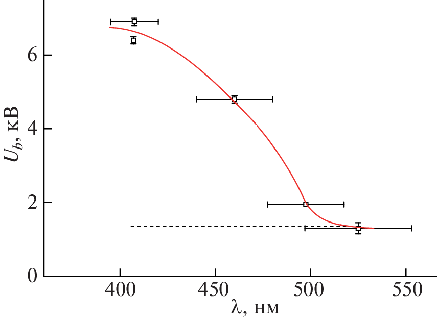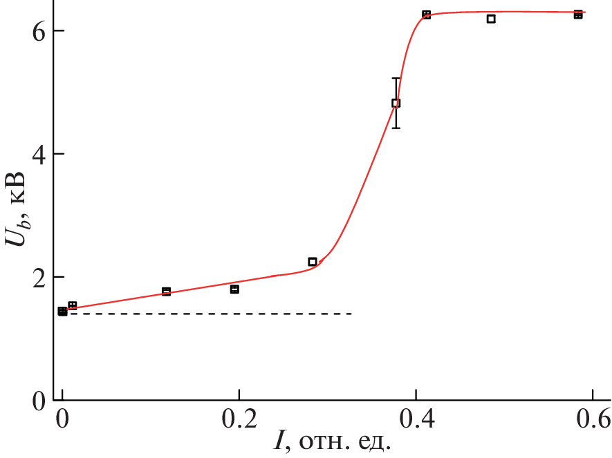 Исследован процесс электрического пробоя в разрядной трубке длиной 80 см и внутренним диаметром 1.5 см (так называемой “длинной разрядной трубке”) в ксеноне при давлении 1 Торр. Пробой осуществлялся положительными импульсами с линейно растущим передним фронтом крутизной dU/dt порядка 10–1–105 кВ/с. Измерялось напряжение пробоя в темноте и при освещении разрядной трубки люминесцентными лампами, светодиодами или диодным лазером. Воздействие освещения на напряжение пробоя зависит от крутизны фронта. При dU/dt > 100 кВ/с напряжение падает, при dU/dt < 100 кВ/с – растет. При 0.1–1 кВ/с этот рост достигает шести раз. Исследована зависимость наблюдаемого эффекта от интенсивности излучения, его длины волны и положения освещаемой области поверхности трубки. Предпробойная волна ионизации ведет себя в этих условиях необычно: ее скорость и интенсивность излучения фронта растут при ее движении. В качестве механизма наблюдаемых явлений рассматривается фотодесорбция электронов с поверхности трубки, в результате которой стенка вблизи анода приобретает положительный заряд. Это приводит к повышению пробойного напряжения и ускоренному движению волны ионизации. Проведены дополнительные эксперименты, подтверждающие наличие в этих условиях стеночного заряда в прианодной области.