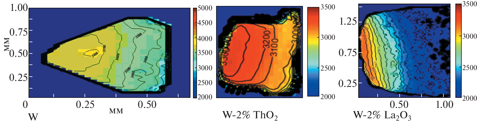 Experiments were carried out to study the stable attachment of an atmospheric pressured argon dc arc to the surface of pure, thoriated and lanthanated tungsten. Using spectroscopic methods electron temperatures and concentrations were obtained in the positive plasma column near the cathode. With a current of 200 A and a plasma gas flow rate of 1.5 g/s, the average values of temperatures were Te ~ 2.6 eV for pure tungsten, Te ~ 2 eV for thoriated and lanthanated tungesten, and concentrations ne ~ 1017 cm–3. In these experiments, the cathode with an insert of lanthanated tungsten (3100 K) had the lowest working surface temperature due to the lower effective work function, while for thoriated and pure tungsten surface temperatures were 3300 and 3800 K, respectively. It was found that at a current of 200 A, the tip of the pure tungsten cathode was in the liquid phase, in contrast to thoriated and lanthanated tungsten that remained in solid phase.