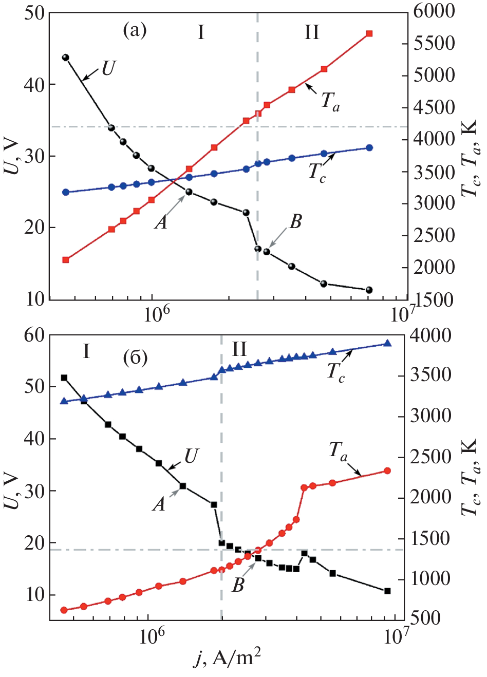 We present the results of numerical studies of the influence of evaporation of anode material on the main characteristics of an arc discharge. Calculations were carried out for an arc discharge in helium as a buffer gas with high-melting-point (using graphite as an example) and low-melting-point (using copper as an example) anodes. The dependences of the main arc-discharge parameters on current density are presented. It is demonstrated that intense evaporation of particles of the anode material into the discharge gap occurs upon reaching the melting point of the anode surface. As a result, the plasma-forming ion is replaced, i.e., the carbon ion in the case of the graphite anode or a copper ion in the case of the copper anode becomes dominant. In the process, a jump in the potential is observed in the dependence of voltage on current density (the volt–ampere characteristic, VAC). Distribution of the main plasma parameters along the discharge gap is presented for different points in the VAC.