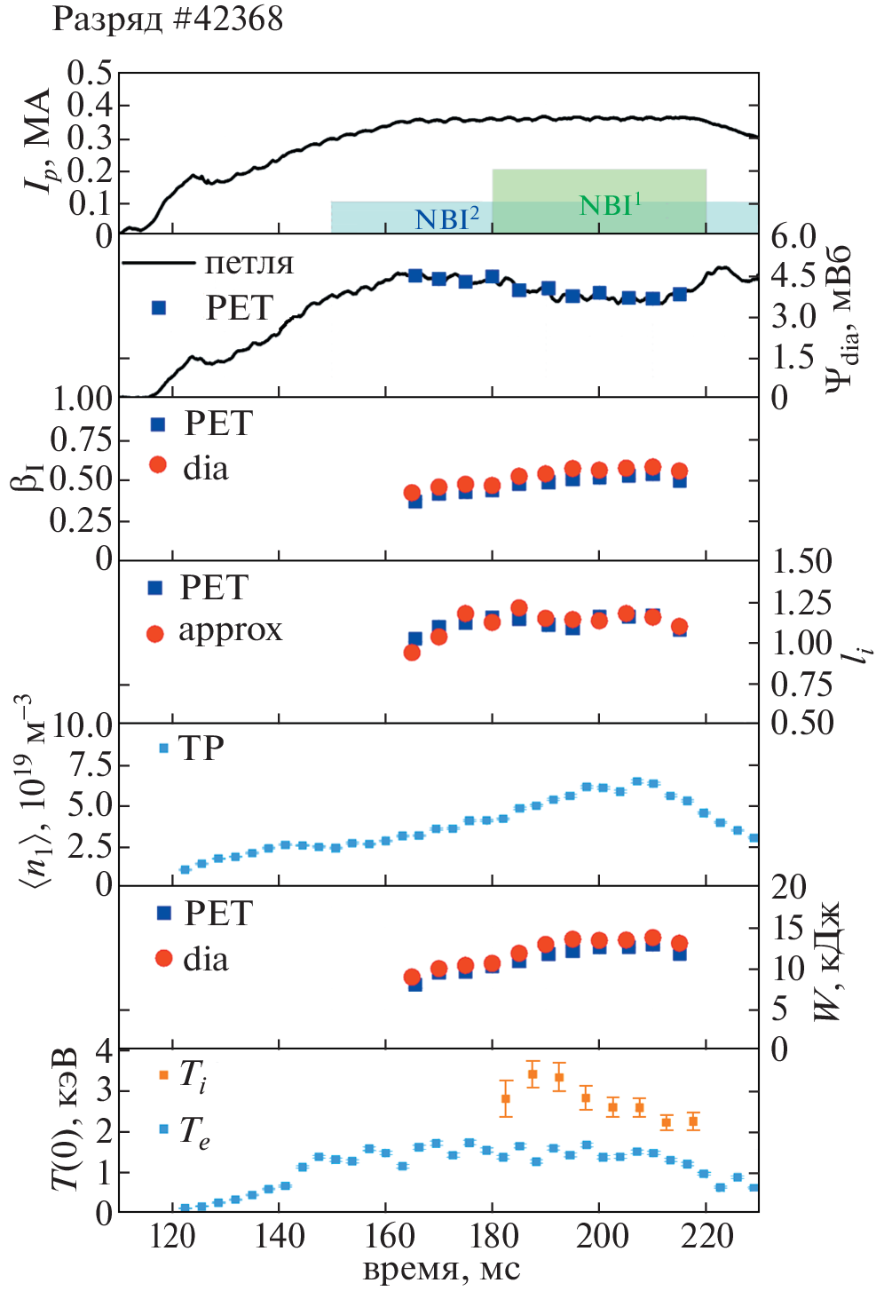 from PET and the experimental one. The discharges from the Globus-M2 tokamak with a toroidal magnetic