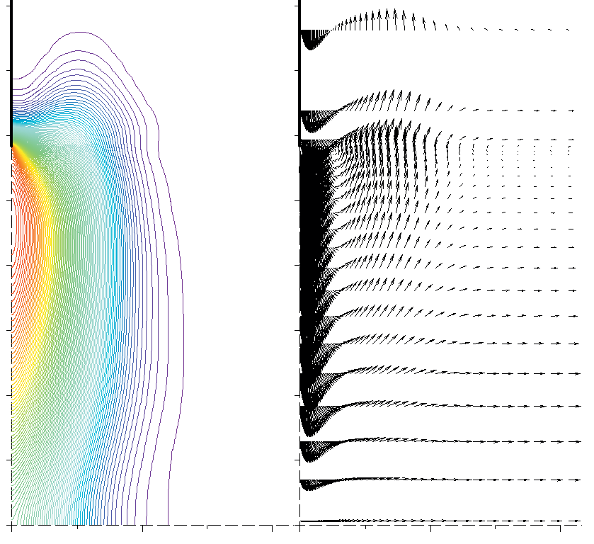 Представлены результаты численного моделирования периодического поверхностного барьерного разряда. Целью работы является исследование механизмов воздействия разряда на среду (воздух при атмосферном давлении), индуцирующее движение воздуха над диэлектрической поверхностью. Численное моделирование выполнялось с помощью компьютерной модели, которая реализует интегрирование системы двумерных уравнений Навье–Стокса для среды в целом, уравнения переноса заряженных частиц и уравнение Пуассона для электрического потенциала. Помимо объемных процессов (ионизация частиц, рекомбинация, дрейф заряженных частиц в сильном электрическом поле, концентрационная диффузия) рассматриваются процессы осаждения частиц на поверхности диэлектрика, приводящие к зарядке диэлектрика. В периодическом барьерном разряде небольшой амплитуды оба механизма, силовой и тепловой, оказывают воздействие на поле течения. Основной эффект разряда состоит в генерации вихревого течения, такого что вдоль поверхности создается струя со средней скоростью ~1–2 м/с.