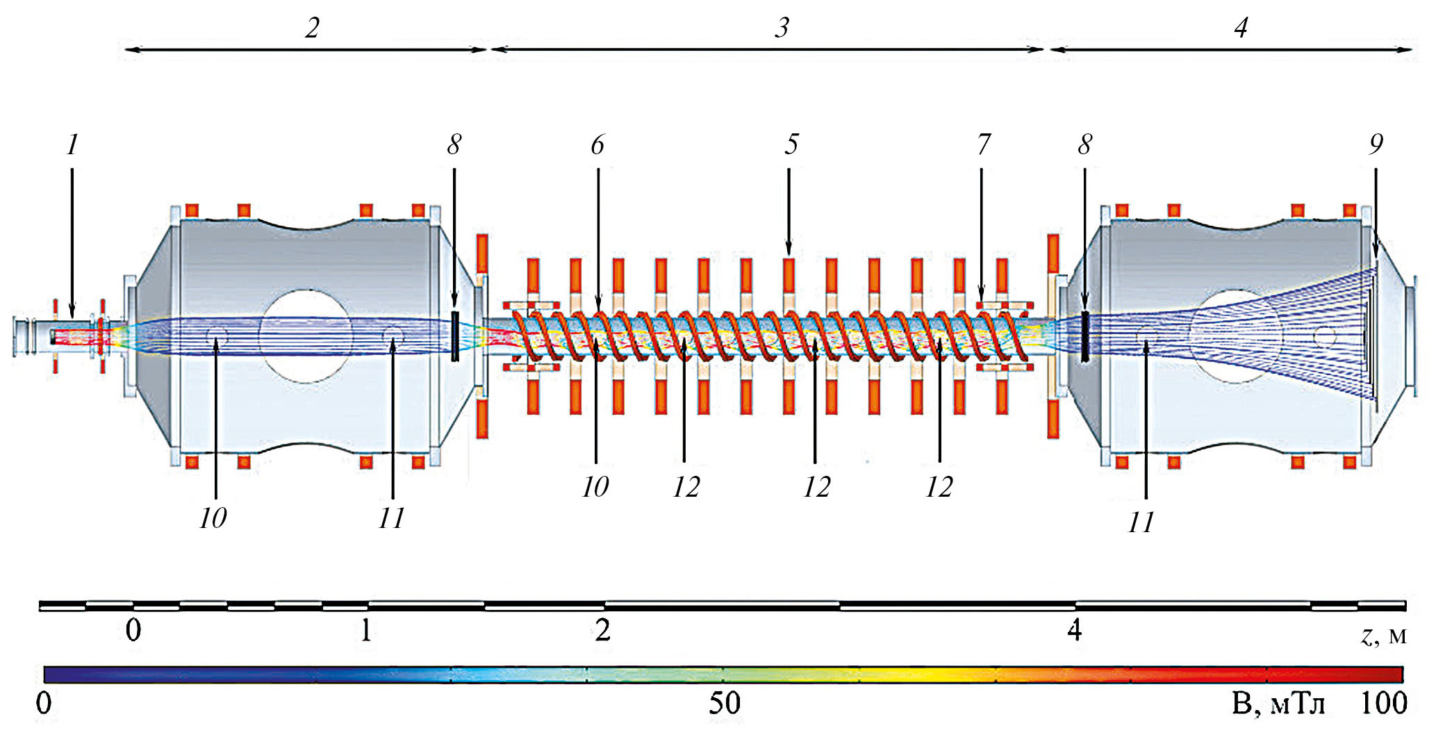 Далее в тексте в качестве начала отсчета продольной координаты Z принимается выходная апертура источника плазмы. Магнитная система состоит из катушек плазменной пушки, катушек входного и выходного расширителей, центрального соленоида с катушкой винтового поля, а также катушек коррекции положения плазменной струи. Прямая и винтовая компоненты магнитного поля задаются независимо друг от друга.