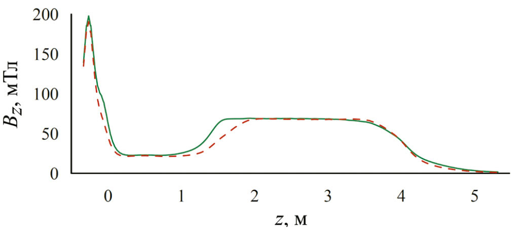 Конфигурация магнитного поля в данной экспериментальной серии представлена на рис. 2 при значении ведущего магнитного поля в транспортной секции 70 мТл для прямого поля (R = 1). Здесь и далее R – отношение максимального и минимального магнитного поля на заданной силовой линии внутри транспортной секции, усредненное по сечению плазмы.
