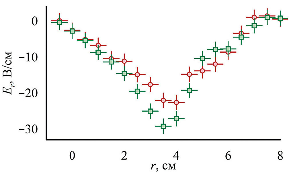 Рис. 3. Распределение радиального электрического поля на Z = 2.04 м в различных конфигурация магнитного поля: красный круг – режим с широкой струей, зеленый квадрат – режим с узкой струей