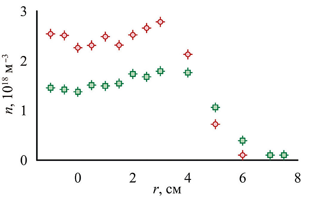 Рис. 4. Распределение плотности плазмы на Z = 2.04 м в различных конфигурация магнитного поля: красный круг – режим с широкой струей, зеленый квадрат – режим с узкой струей