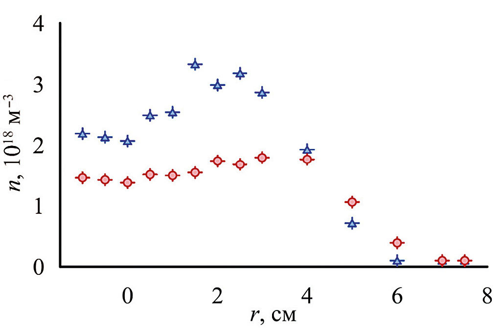 Рис. 5. Распределение плотности плазмы на Z = 2.04 м в режиме с узкой струей: красный круг – в прямом поле, синий треугольник – в винтовом поле