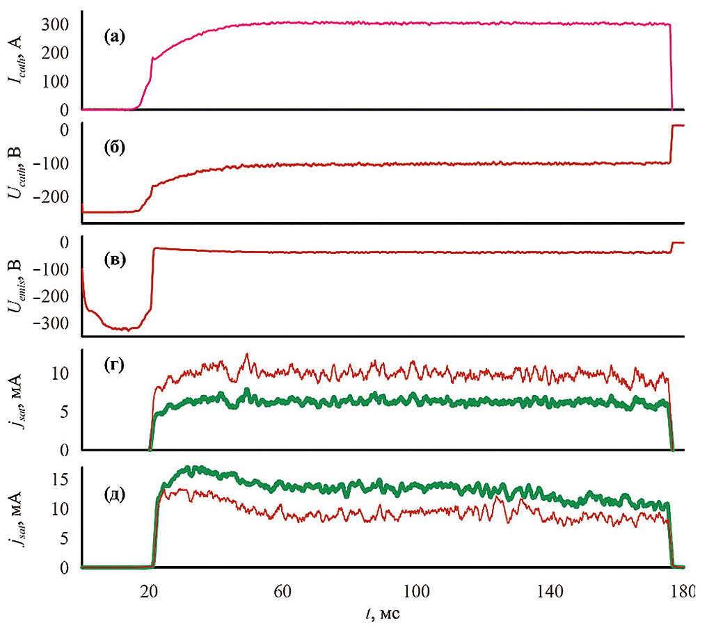 Рис. 7. Типичные осциллограммы основных сигналов: а – плазменный ток; б – напряжение, подаваемое между анодом и катодом источника плазмы, в – потенциал эмиссионного зонд, токи ионного насыщения наветренной up (тонкая красная линия) и подветренной down (толстая зеленая линия) сторон в прямом (г) и винтовом (д) магнитном полях