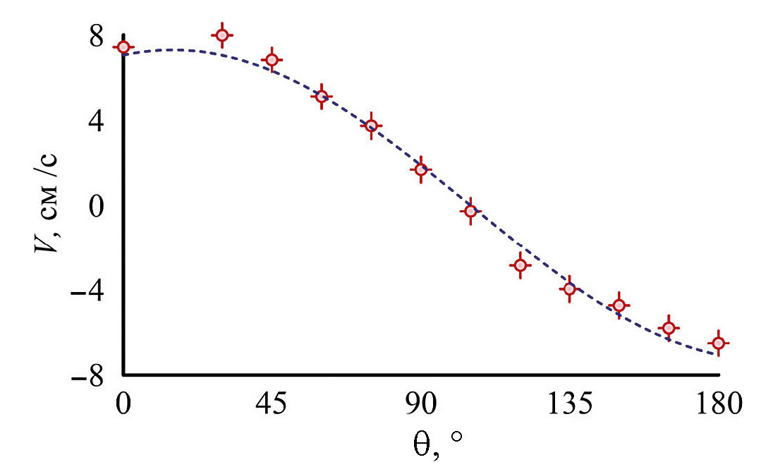 Зависимость потоковой скорости от угла поворота зонда Маха представлена на рис. 8. Скорости принимают значения больше и меньше нуля. Это согласуется с тем, что при вращении зонда “наветренная” и “подветренная” стороны сменяют друг друга, при этом модули скоростей при строго перпендикулярном и перевернутом на 180° зонде практически совпадают. Полученное распределение скорости отвечает функции вида V = V0 cos (θ + φ0), где V0 = (7.3 ± 0.9)106 см/с, θ = 15±3°.