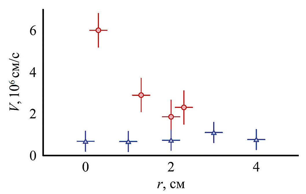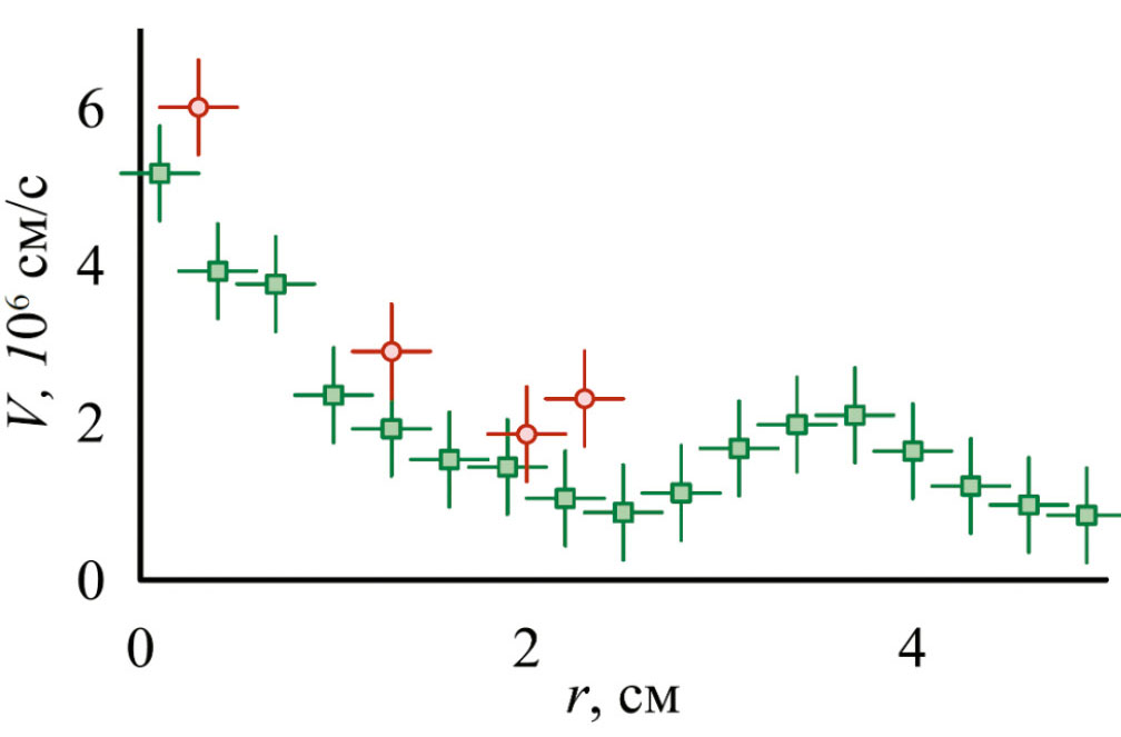 В центре плазменного шнура радиальное электрическое поле равно нулю, поэтому, зная его распределение, можно установить центр плазменной струи, что позволяет сравнивать полученные результаты скоростей в одинаковых координатах. Радиальные зависимости модуля скорости, измеренные в двух координатах, представлены на рис. 10. Видно, что диапазон и зависимость от радиуса плазмы совпадают. Максимальная продольная скорость около центральной области ~ 5 · 106 см/с. Полученные данные по значению продольной скорости согласуются с ранее полученными результатами.