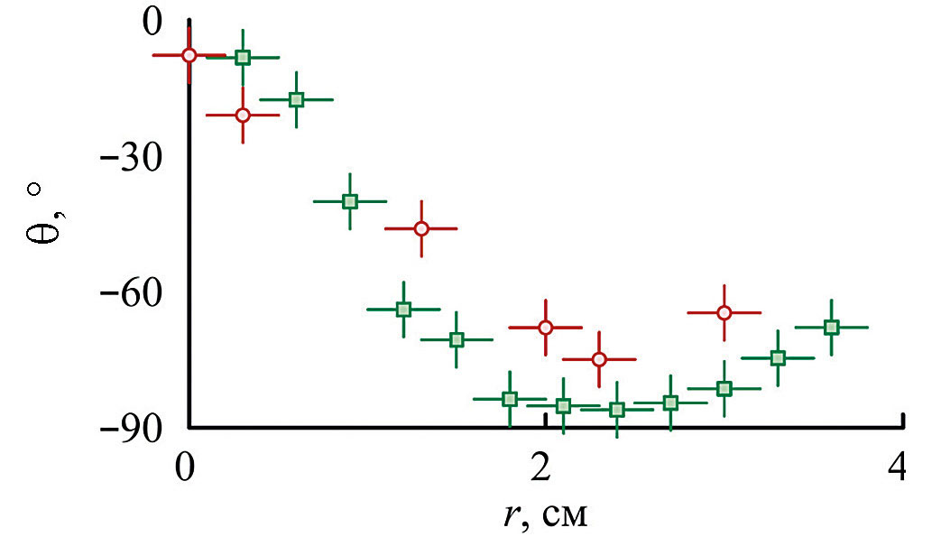 Рис. 11. Радиальная зависимость угла между потоковой скоростью и ведущим магнитным полем: красный круг – вращающийся зонд в Z = 2.4 м, зеленый квадрат – зондовая сборка в Z = 2.94 м