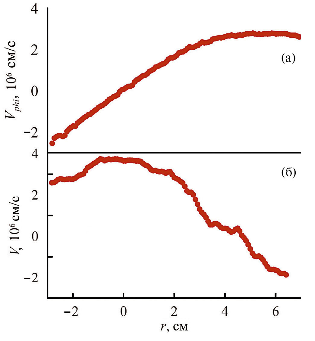 Для проверки результатов, полученных зондовыми методами, была определена потоковая скорость плазмы в выходном расширителе установки СМОЛА с помощью доплеровской спектрометрии. При R = 1 получено распределение зависимости азимутальной скорости от радиуса плазмы в выходном расширителе (рис. 12а), которое отвечает твердотельному вращению, соответствующему угловой скорости вращения ω ≈ 0.61 · 106 c–1. На рис. 12б представлена радиальная зависимость потоковой скорости плазмы в выходном расширителе. Максимальная продольная скорость достигается в центре плазменного шнура: V|| ~ 4 · 106 см/с. Данная скорость соответствует ожидаемым оценкам и скоростям, полученным с помощью зондов Маха с учетом расположения диагностик в выходном расширителе и транспортной секции соответственно.