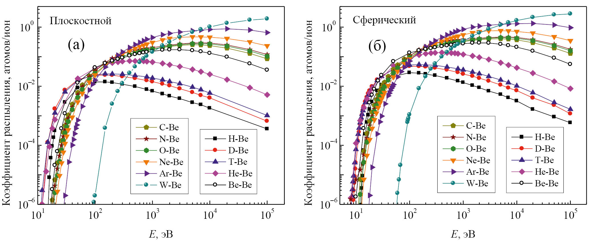 Электронная температура в районе сепаратрисы может составлять 100–150 эВ, электронная плотность – 1013 частиц/см3 [5]. При этих параметрах частицы примесей присутствуют в плазме в виде многозарядных ионов. При бомбардировке дивертора ионы примесей ускоряются потенциалом плазма-стенка, их энергия существенно увеличивается. Тем самым, ионы примесей могут вызвать значительно большее распыление дивертора, по сравнению с распылением водородными частицами. Таким образом, достоверная информация о коэффициентах распыления бериллия и вольфрама примесями важна для оценки работоспособности материалов, применяемых в токамаке ИТЭР.
