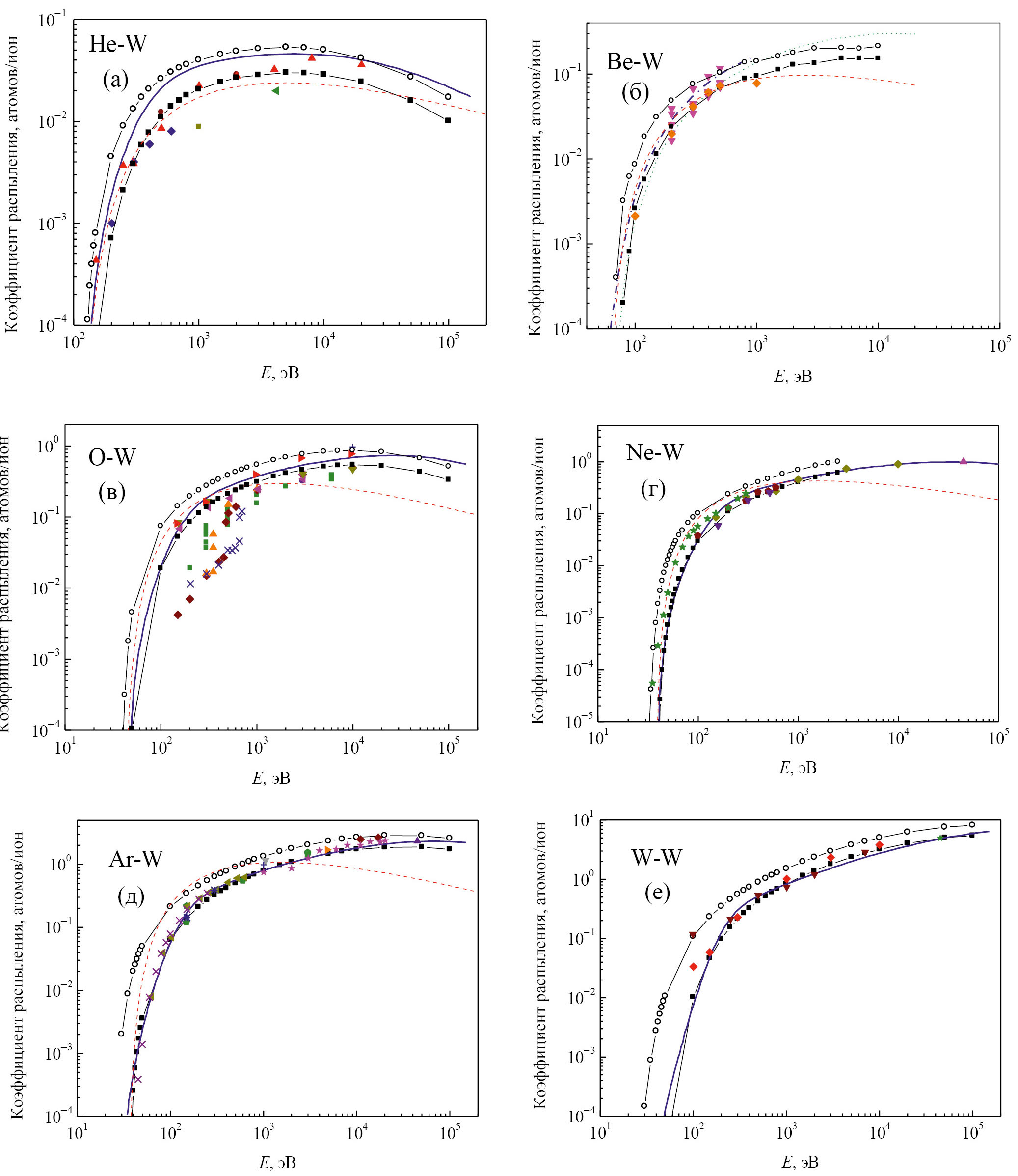 Рис. 6. Коэффициент распыления мишени из вольфрама атомами: (а) – He, (б) – Be, (в) – O, (г) – Ne, (д) – Ar и (е) – W в зависимости от энергии бомбардирующих частиц. Наш расчет: для плоского барьера – линия с квадратами, для сферического барьера – линия с кружками. Синяя сплошная линия – расчет группы Экштайна [6, 7]. Точки – результаты экспериментальных работ, приведенных в монографии [6]. Штриховая линия – расчет по формуле (2) [19]. Для случая Be-W приведены данные расчетов из работ [22, 23] (квадраты и треугольники) с использованием методов молекулярной динамики, пунктирная кривая – расчет с использованием формул из работы [24], штрихпунктирная линия – расчет программой SDTrimSP из работы [25]