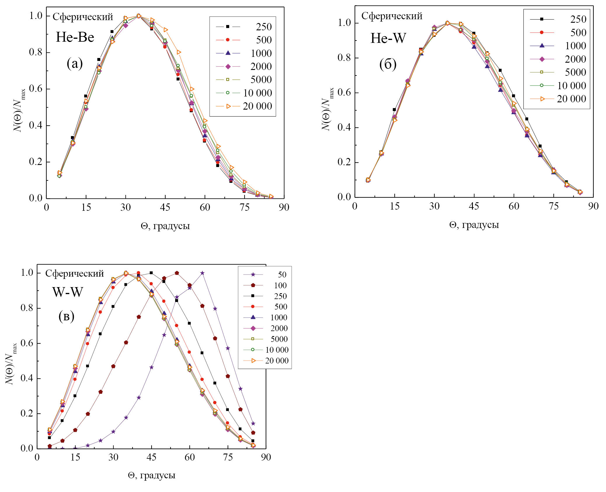 Рис. 8. Нормированное угловое распределение распыленных частиц для сферического поверхностного потенциального барьера: (а) случай He-Be; (б) случай He-W; (в) W-W
