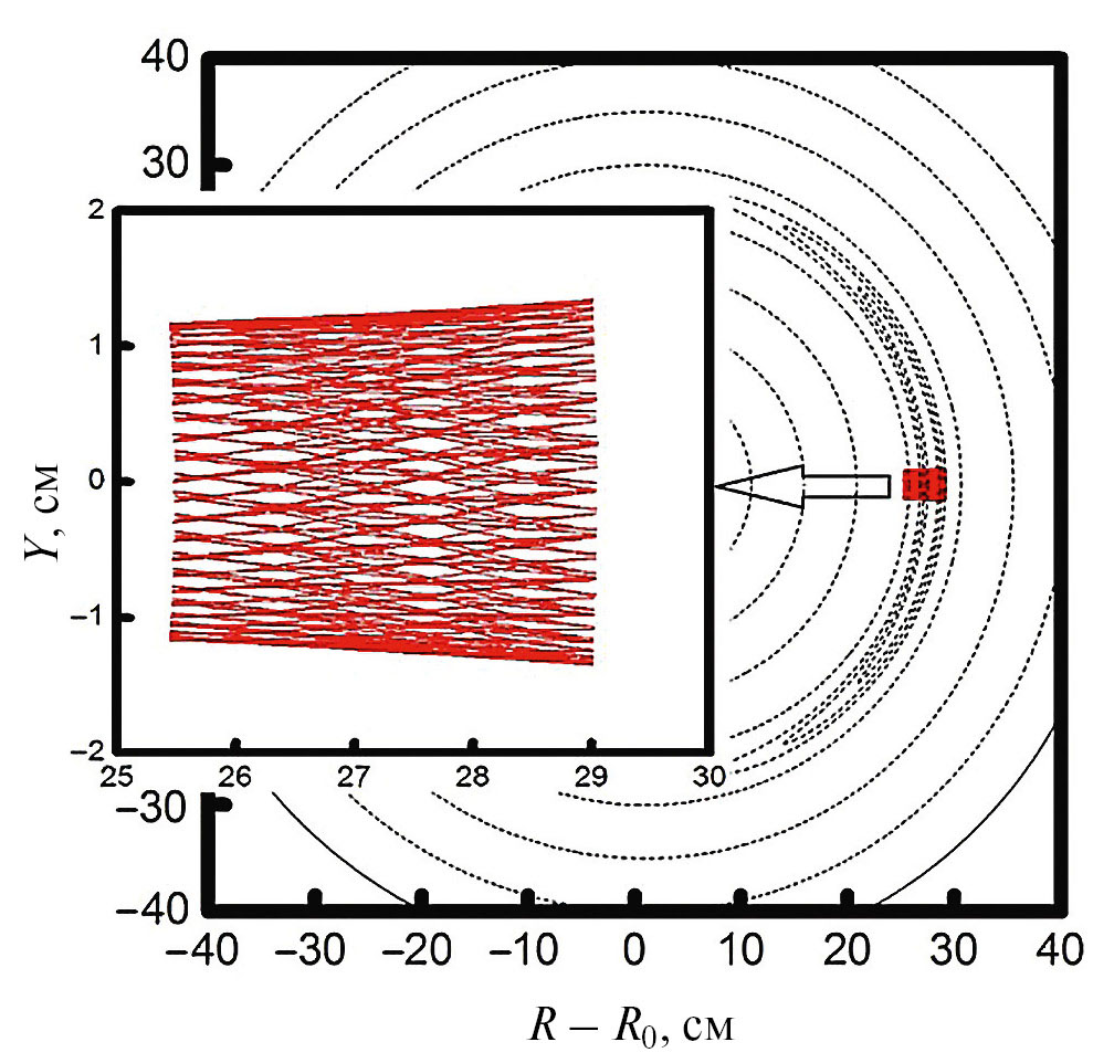 На рис. 1 показана траектория верхней гибридной волны (сплошная линия, fm = 69.71 ГГц, mx = 45) в полоидальном сечении токамака TEXTOR [29]. Магнитные поверхности изображены пунктирными линиями. В окне траектория ВГ-волны показана в увеличенном масштабе в окрестности экваториальной плоскости.