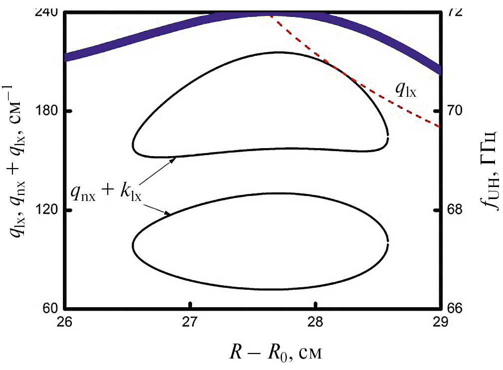 На рис. 5 показано волновое число первой ВГ-волны fm = 69.71 ГГц, , m = (40,3), сдвинутое вниз на величину волнового числа необыкновенной волны накачки, показано сплошной линией. Волновое число второй ВГ-волны – пунктирная линия. Профиль ВГ-частоты изображен толстой сплошной кривой.