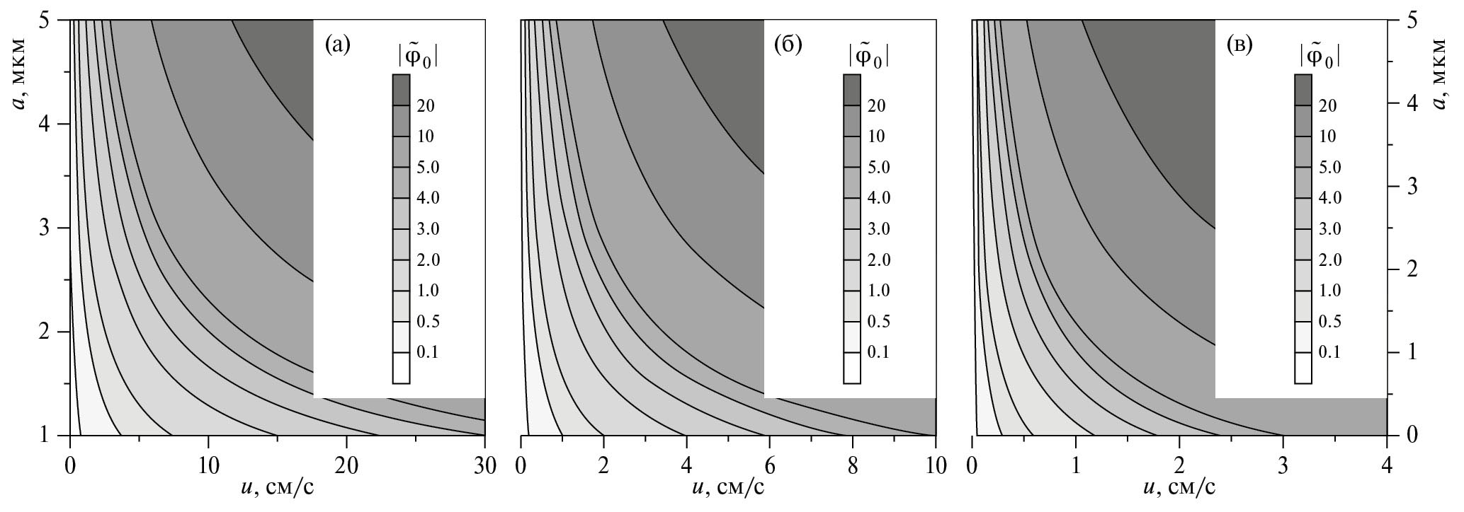 На рис. 2 приведены модули амплитуд солитонных решений (67) в зависимости от характерных размеров пылевых частиц a и скорости распространения солитона u при = 5° для nd0 = 10–4 см–3 (рис. 2а), nd0 = 10–3 см–3 (рис. 2б), nd0 = 10–2 см–3 (рис. 2в).