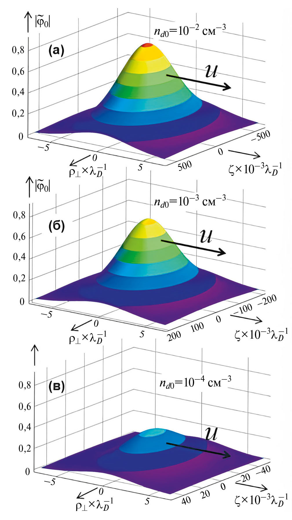 Рис. 3. Трехмерный солитон для случаев: nd0 = 10–2 см–3 (а), nd0 = 10–3 см–3 (б), nd0 = 10–4 см–3 (в)