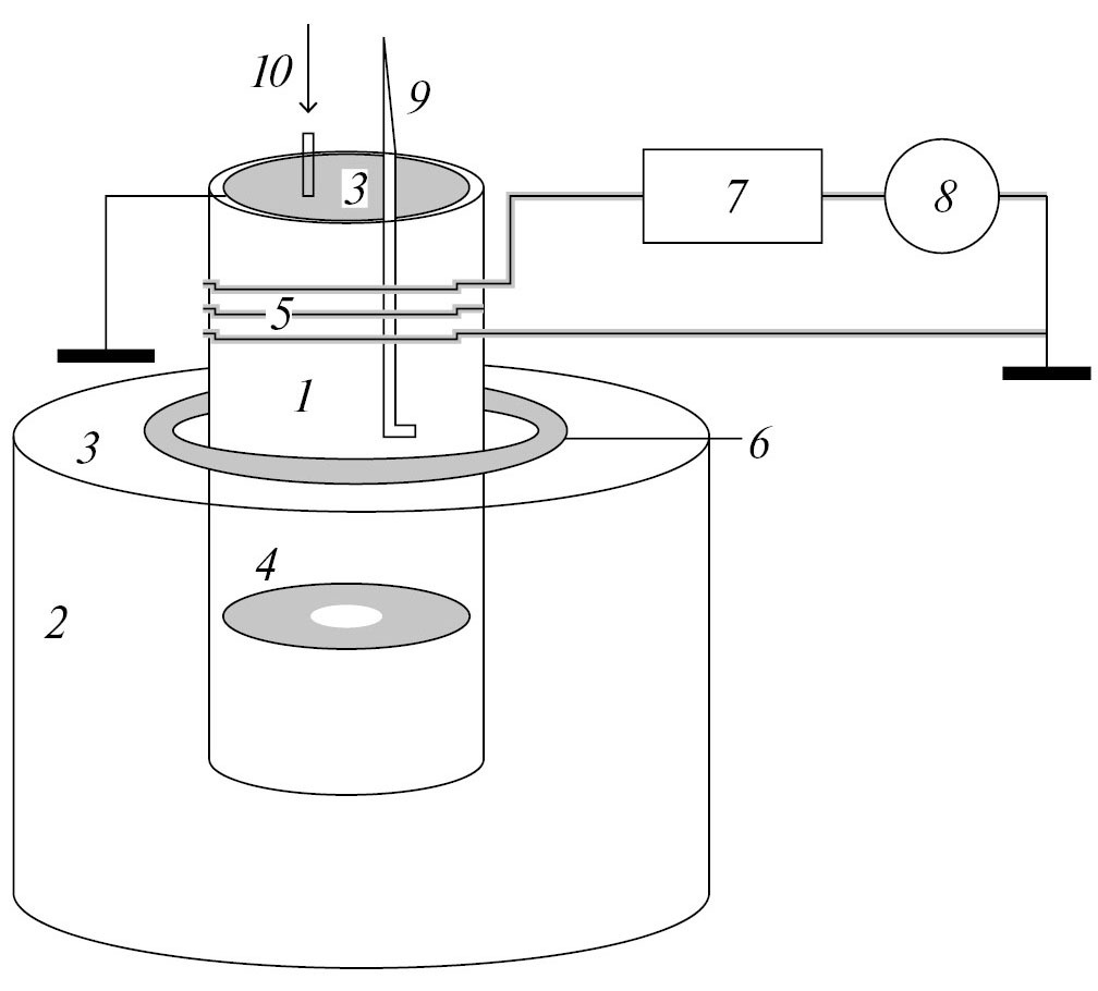 Рис. 1. Схема источника плазмы: 1 — кварцевый цилиндр, 2 — вакуумная камера, 3 — металлический фланец, 4 — нижний электрод с отверстием, 5 — спиральная антенна, 6 — электромагнит; 7 — система согласования; 8 — ВЧ-генератор, 9 — зонд, 10 — газоввод