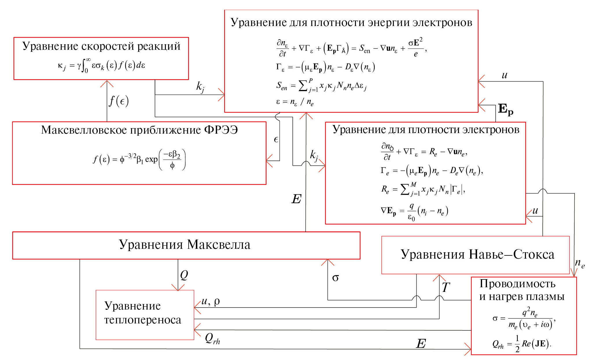 Уравнения для плотности электронов, энергии электронов и возбужденных состояний имеют следующий вид: