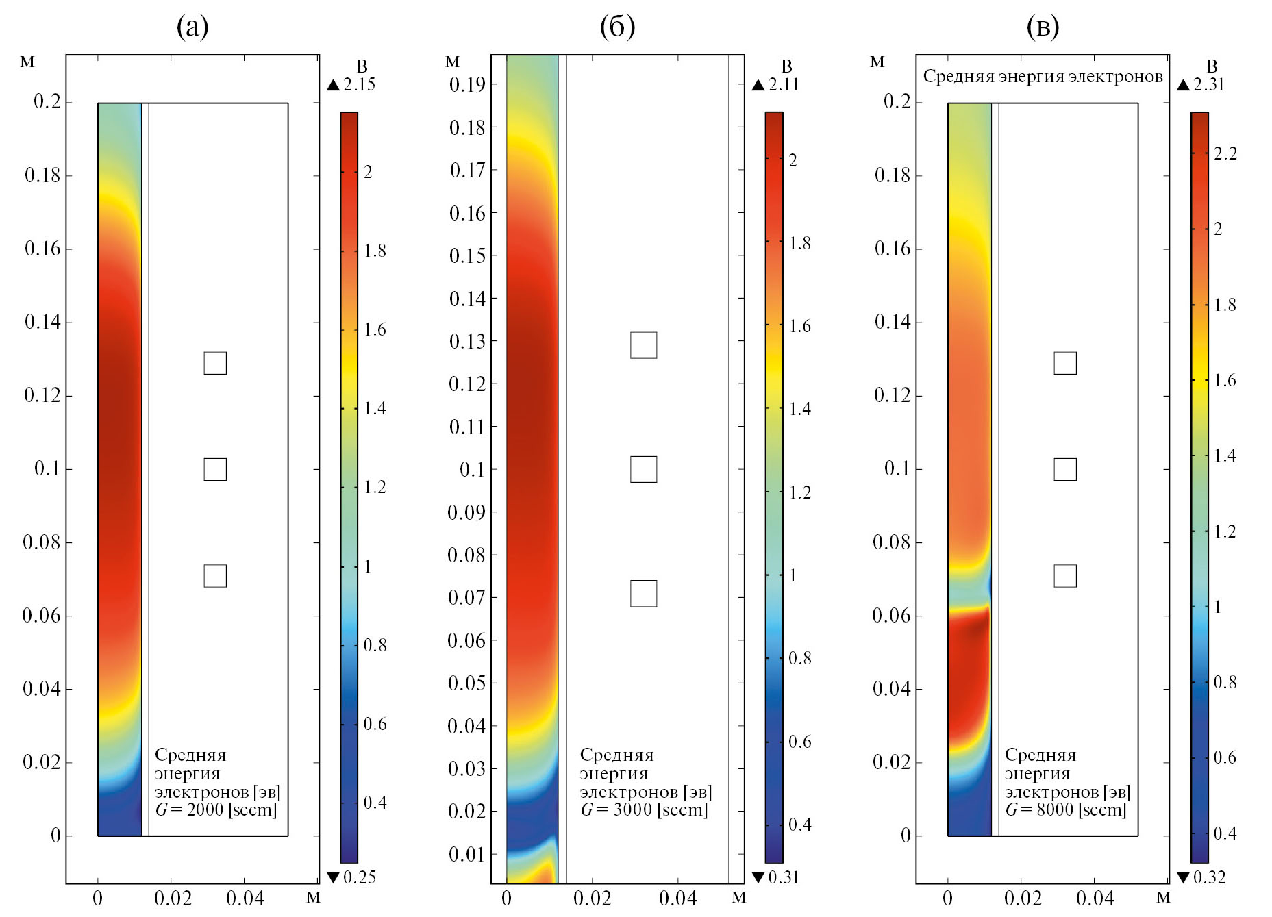 Рис. 5. Пространственное распределение средней энергии электронов <e> при расходе газа G = 2000 sccm (а), G = 3000 sccm (б), G = 8000 sccm (в)