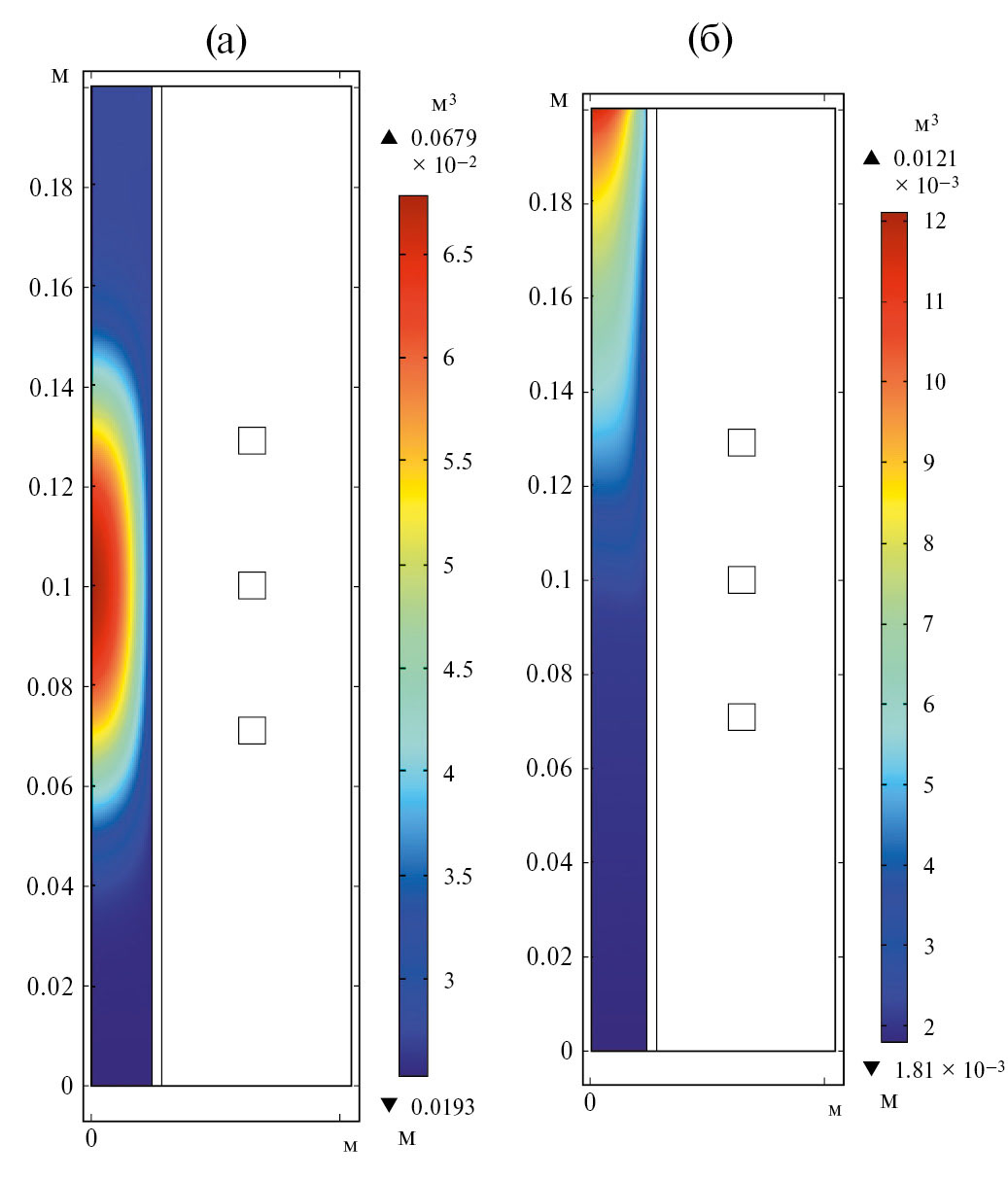 В итоге газодинамические параметры плазмы рассчитываются с помощью уравнений Навье–Стокса (3) с названными условиями на границах inlet и outlet. Результатом решения являются пространственные распределения скорости газа v и давления p (рис. 9), которые применяются в расчетах уравнений на концентрацию электронов, ионов и метастабилей (8)–(11). Данные распределения в зависимости от расхода газа G показаны на рис. 10, 11.