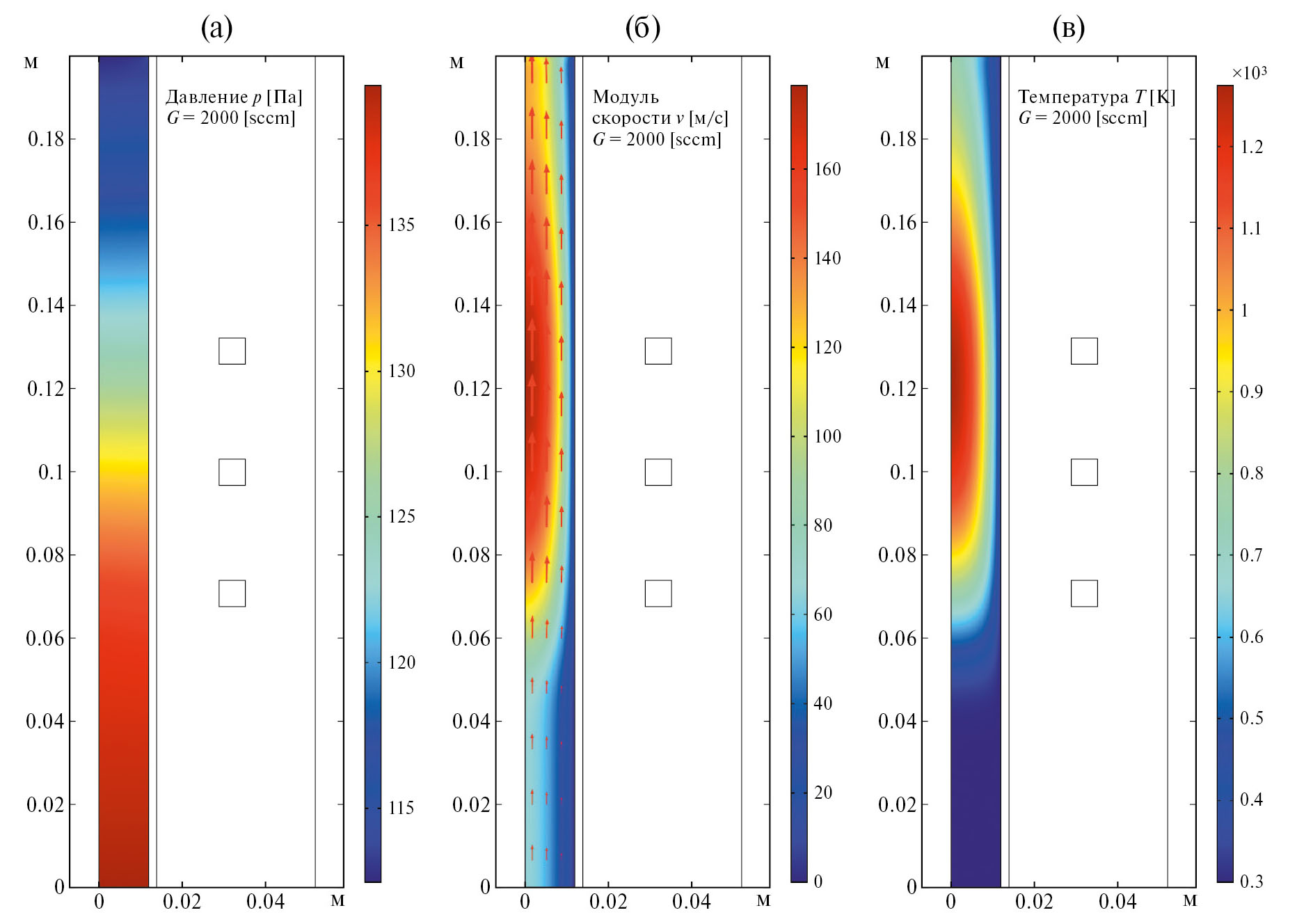 Рис. 9. Пространственное распределение давления p (а), модуля скорости v (б) и температуры газа (в) при расходе газа G = 2000 sccm