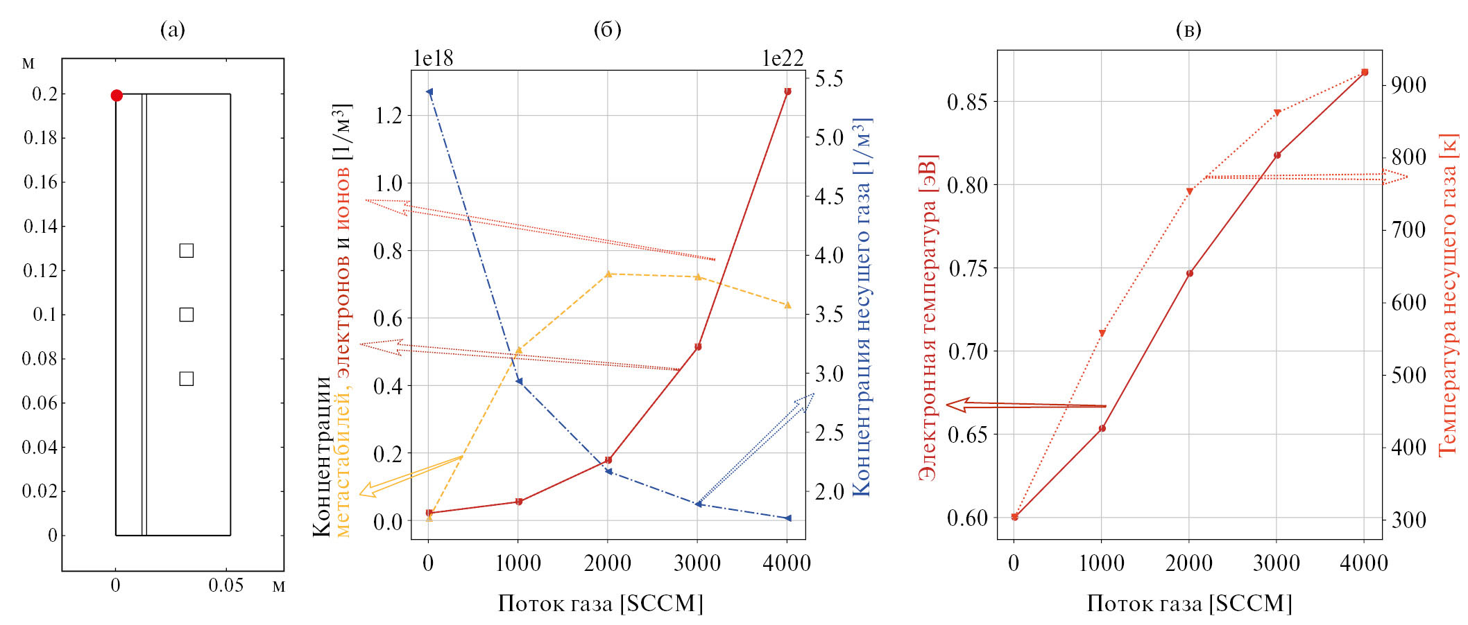 Рис. 10. Область распределения (а); зависимость концентрации электронов, возбужденных состояний и ионов на выходе разрядной трубки ne,m,i:outlet от расхода газа G (б). Графики концентрации электронов ne и ионов ni накладываются друг на друга, вследствие чего зависимость ni плохо видна на рисунке; температура электронов и температура нейтральных частиц в зависимости от расхода газа G (в)