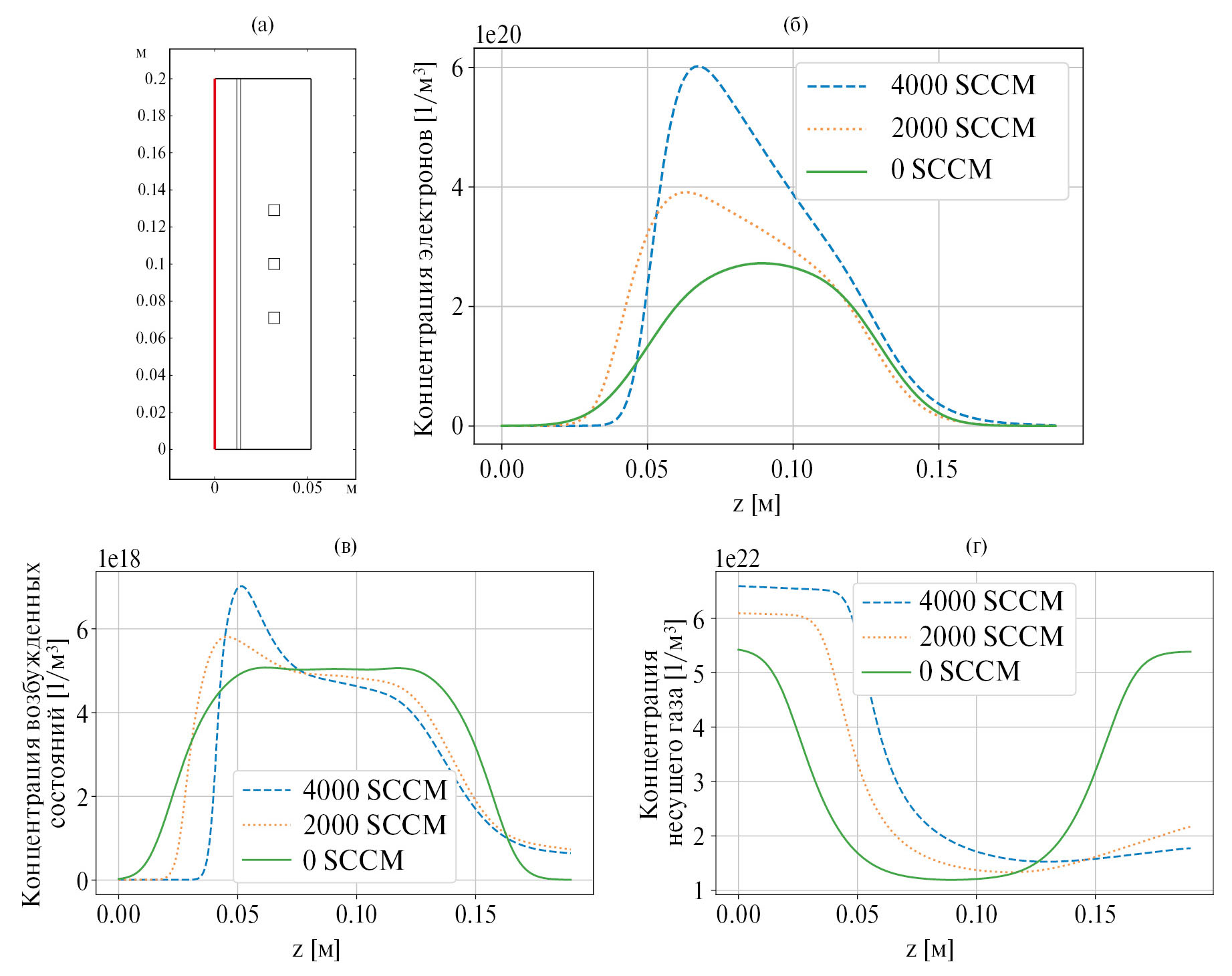 Получено: с ростом скорости газа проходит смещение распределения концентрации электронов вниз по потоку, но в пределах области индуктора. В отличие от этой модели, в данной работе учитываются ступенчатая ионизация и коэффициенты диффузии и частоты ионизации, зависящие от ФРЭЭ. Поэтому в представленных результатах расчета на рис. 11б и 11в при увеличении расхода газа от 0 до 2000 sccm максимум концентрации электронов и возбужденных частиц смещается вверх по потоку, а с дальнейшим повышением расхода смещается вниз по потоку. Смещение максимума концентрации электронов и возбужденных частиц в направлении противоположно потоку может быть вызвано влиянием ступенчатой ионизации.