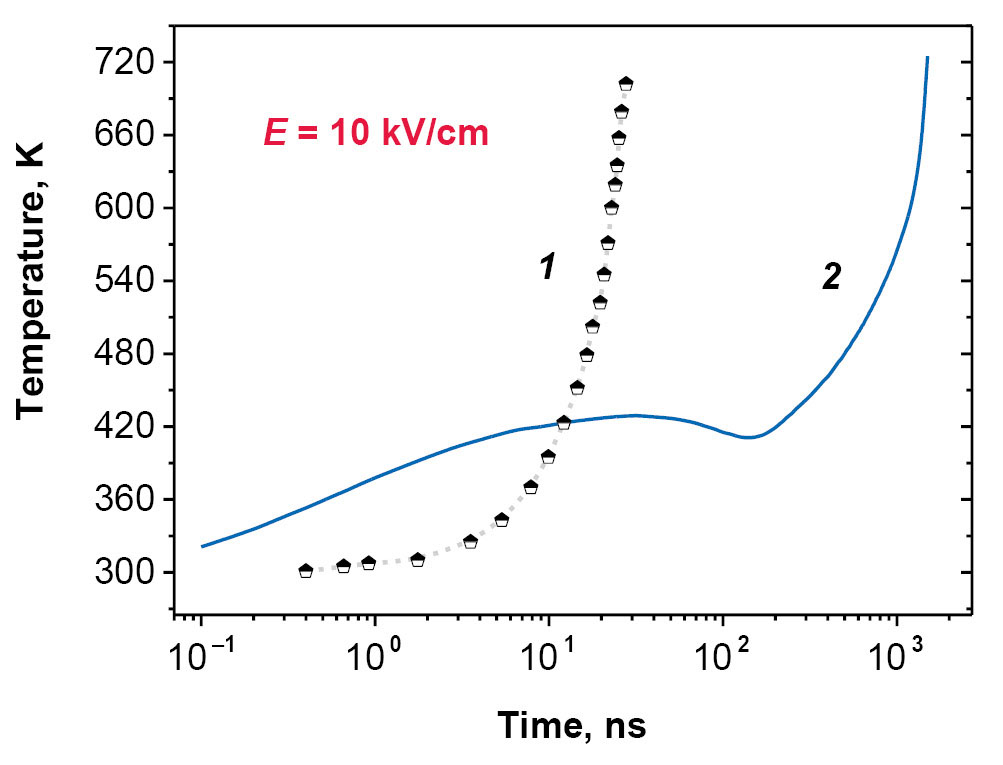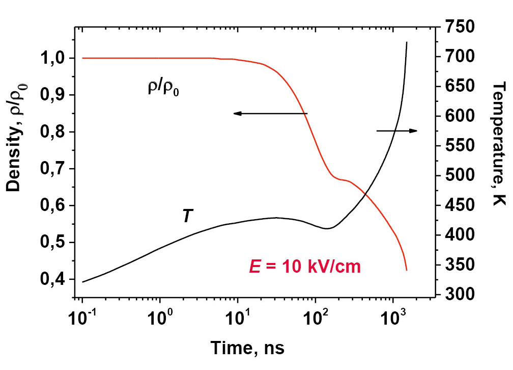 Численное моделирование разряда в постоянном однородном электрическом поле в плазменном канале, созданном филаментированным лазерным импульсом, проводилось в работах [37, 38]. В обоих случаях получена резкая зависимость времени пробоя разрядного промежутка (времени от момента создания плазменного канала до образования горячего разреженного канала с высоким значением E/N) от напряженности постоянного электрического поля. Однако количественное расхождение результатов расчетов с данными эксперимента [36] было существенным, более порядка величины.