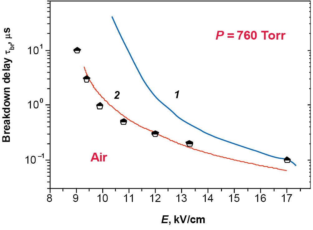 Расчеты проводились для условий, соответствующих экспериментам [36], результаты сравнивались с данными измерений по таким важным параметрам, как зависимость времени пробоя разрядного промежутка от напряженности электрического поля.
