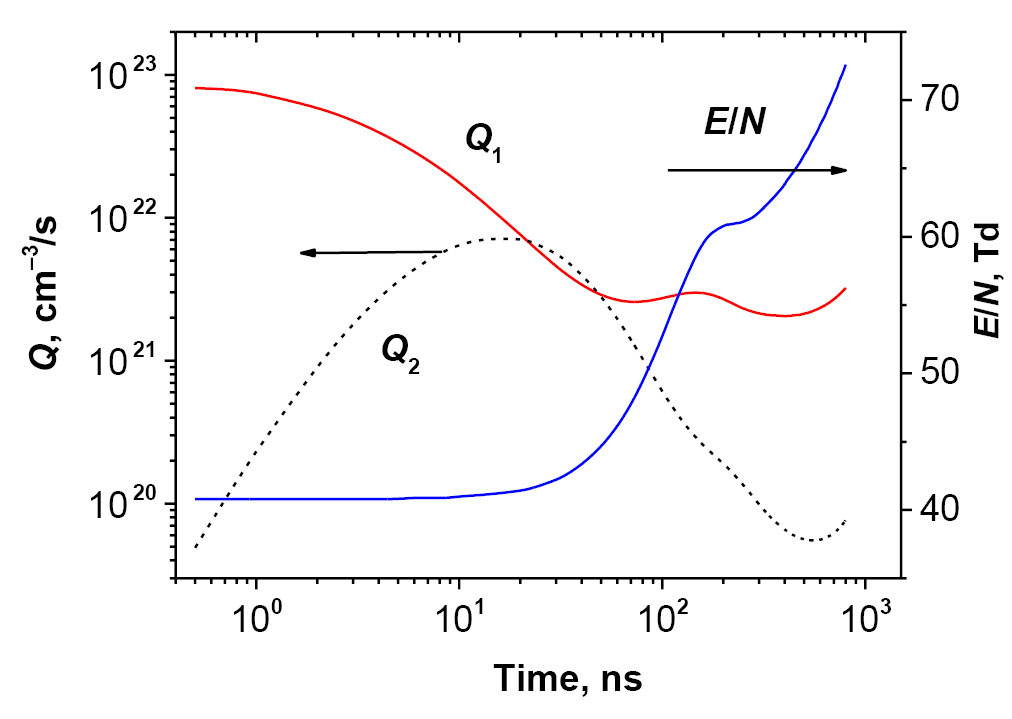 При P = 760 Торр, T = 500 K и Q10 /[N2] = 10–13 см3/с [57], получим τ0 ~ 50 нс. Отметим, что для более полного описания механизма нагрева газа в результате процессов VV-обмена необходимо включение в расчетную модель системы уравнений поуровневой колебательной кинетики N2(v), что предполагается сделать в последующих работах.