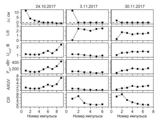 В первые два дня эксперимента проводился обмер режима до начала литиевого напыления. Видно, что каждая литиизация сопровождается сильным уменьшением рециклинга и притока примесей углерода и кислорода, измеряемых вблизи диафрагмы. Уменьшение притока примесей приводит к падению среднего заряда плазмы Zeff, уменьшению радиационных потерь, измеряемых пироэлектрическим болометром и полупроводниковыми датчиками AXUV, а также интенсивности мягкого рентгеновского излучения из плазмы. Однако, когда литиизация не проводилась, уровень примесей начинал возрастать.