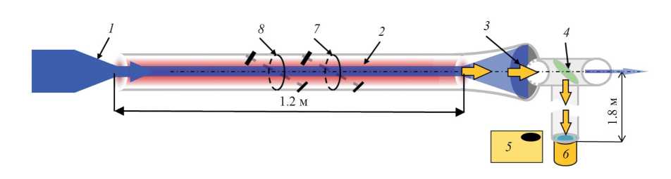 Рис. 1. Схема плазменной части установки ГОЛ-ПЭТ с демонстрацией пути распространения потока терагерцового излучения и местоположения диагностик для его регистрации. 1 — инжектируемый РЭП; 2 — плазма; 3 — поток излучения; 4 — поворотное зеркало; 5 — полихроматор; 6 — калориметр; 7 — интерферометр; 8 — томсоновское рассеяние.