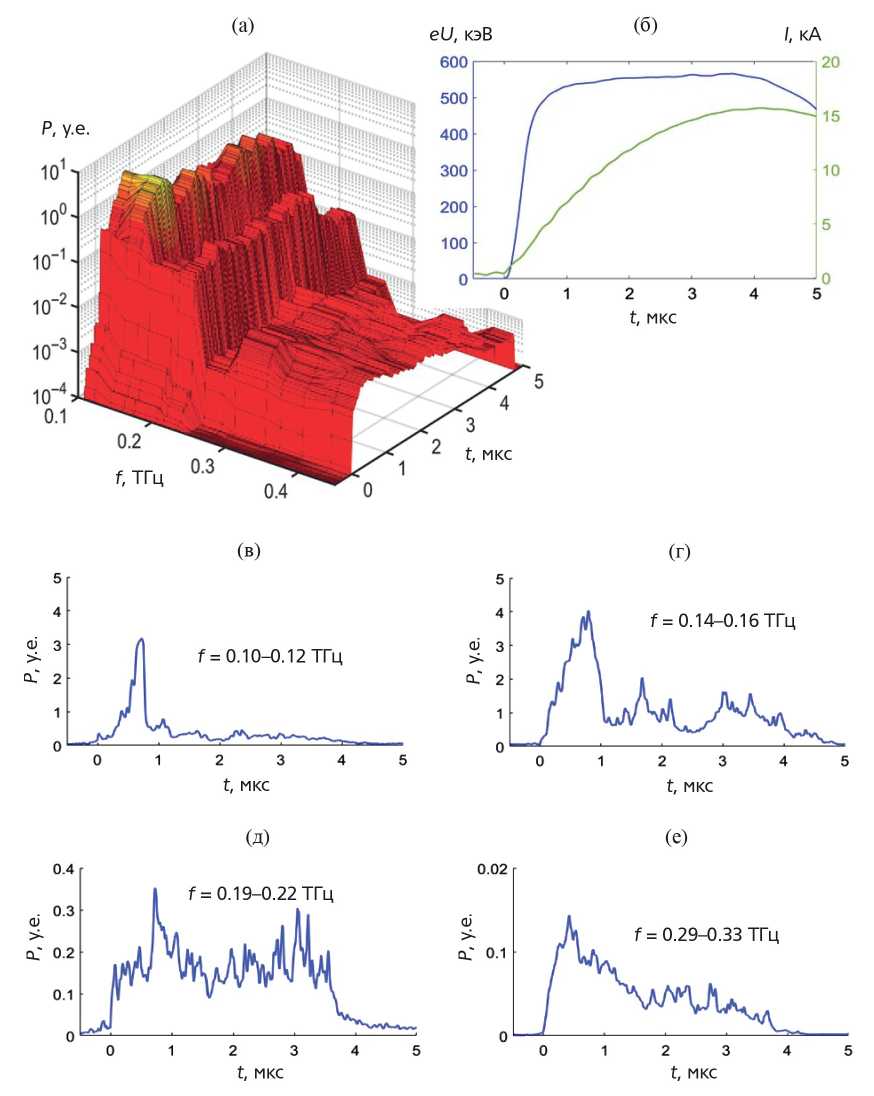 Рис. 3. Спектральная плотность излучения в выведенном в атмосферу потоке излучения (а), которая зарегистрирована восьмиканальным полихроматором при распределении плотности плазмы, представленной на рис. 2а. Спектральная плотность на рис. 3а отложена по оси ординат в относительных единицах. Осциллограммы тока инжектируемого пучка и энергии пучковых электронов (б). Сигналы интенсивности излучения, поступившие от каналов полихроматора (в-е) для различных частотных интервалов. Все сигналы усреднены по серии из 9 выстрелов.
