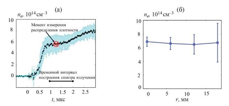 Распределение плотности по радиусу столба, измеренное в момент 1.2 мкс методом томсоновского рассеяния, приведено на рис. 5б. Средняя величина плотности плазмы по сечению столба по данной серии выстрелов составила 7±0.5·1014 см−3. Близкие значения плотности плазмы, измеренные оптическими диагностиками в двух различных сечениях, расстояние между которыми составляет 22 см, позволяют утверждать о том, что плотность плазмы остаётся практически неизменной на таком отрезке плазменного столба в интервале времени от одной до двух микросекунд, отсчитывая от момента начала инжекции пучка.