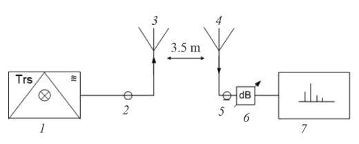 Рис. 2. Схема стенда для измерения спектра излучаемого сигнала: 1 — приемо-передатчик (портативная радиостанция) VX-2100, 2 и 5 — коаксиальные фидеры, 3 — излучающая антенна (ПНВА или МНВА), 4 — измерительная антенна, 6 — аттенюатор, 7 — анализатор спектра.