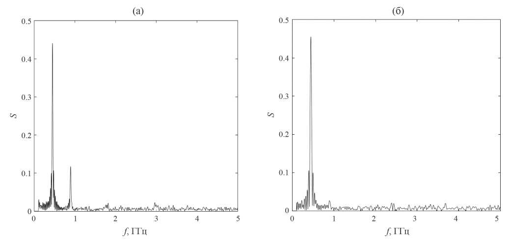 Рис. 5. Спектры излучения ПНВА (результаты моделирования) в относительных единицах для двух случаев возбуждения ПНВА: через центральный электрод (а), коаксиальный переходник (б).