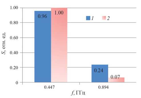 Рис. 6. Нормированные гистограммы спектров (моделирование) для двух случаев возбуждения ПНВА: 1 — через центральный электрод, 2 — коаксиальный переходник.